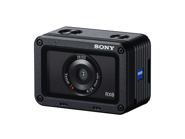 パッと見では「GoPro 的な横型にデザインリニューアルしたアクションカム」に見える佇まいですが、側面のツァイスロゴや正面の「RX0」の記載は紛れもなく RX シリーズの系譜。
