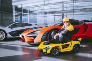 カラーリングは何色にするか相当悩みました。赤だとありきたりで面白くないし、ヒーローカラーであるヴィクトリーグレイはカッコイイけど缶スプレーでは再現できません。マクラーレンのチームカラーであるパパイヤオレンジという選択肢もあるけど、セナ時代のマクラーレンはマールボロの赤白のイメージだからオレンジって感じじゃない。ならばセナのヘルメットの色を引用すれば良いのでは?と思っていたところ、マクラーレン自身がこのクルマのデザインを模した子供用ペダルカーでそのものズバリのカラーを出しているじゃないですか。