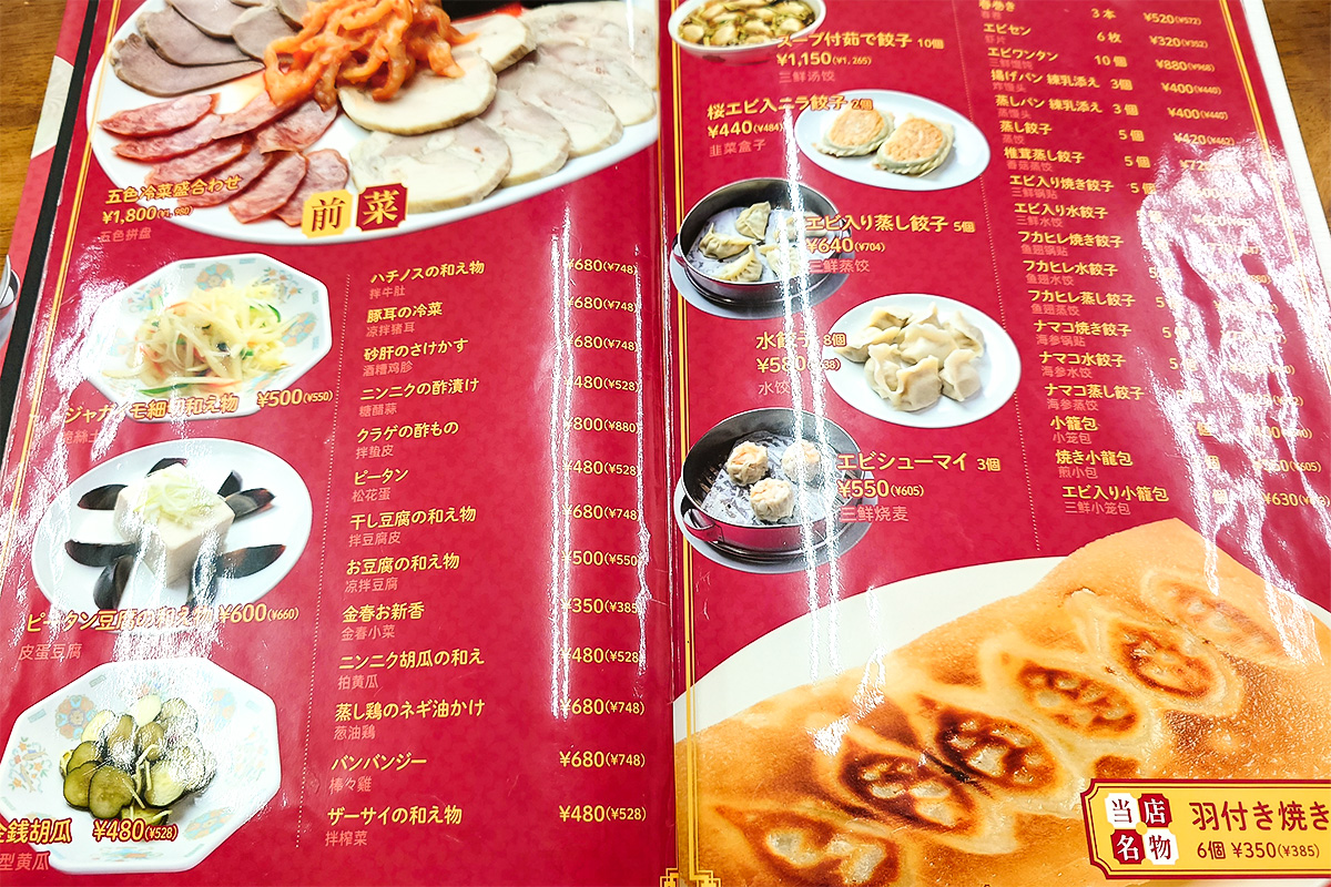 メニューは数え切れないほど種類の多い餃子を中心に、でも餃子だけでなく中華料理も多数。種類が多すぎて目が泳いでしまうほど。