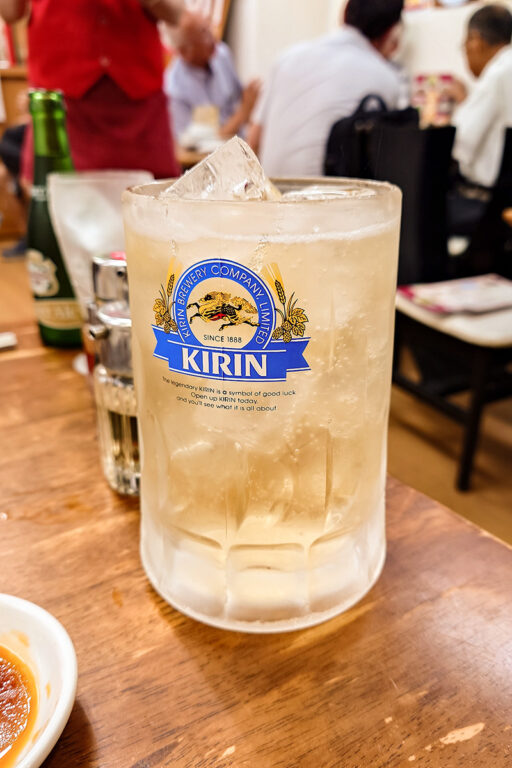 ハイボール(メガサイズ)。暑い日はこれくらいの大ジョッキをゴキュッといって喉を潤したくなります。