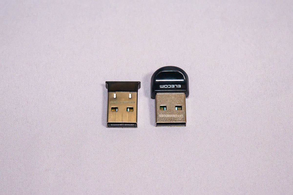 見た目はなんてことない USB レシーバーです。他製品と比べると出っ張りが少しだけ大きいですが、ノート PC ならともかくデスクトップなら誤差範囲。逆に指掛かりが良くて挿抜しやすいとも言えます(そんなに挿抜しないけど)。あと、出っ張りが大きい分アンテナ感度が良かったりするんですかね。