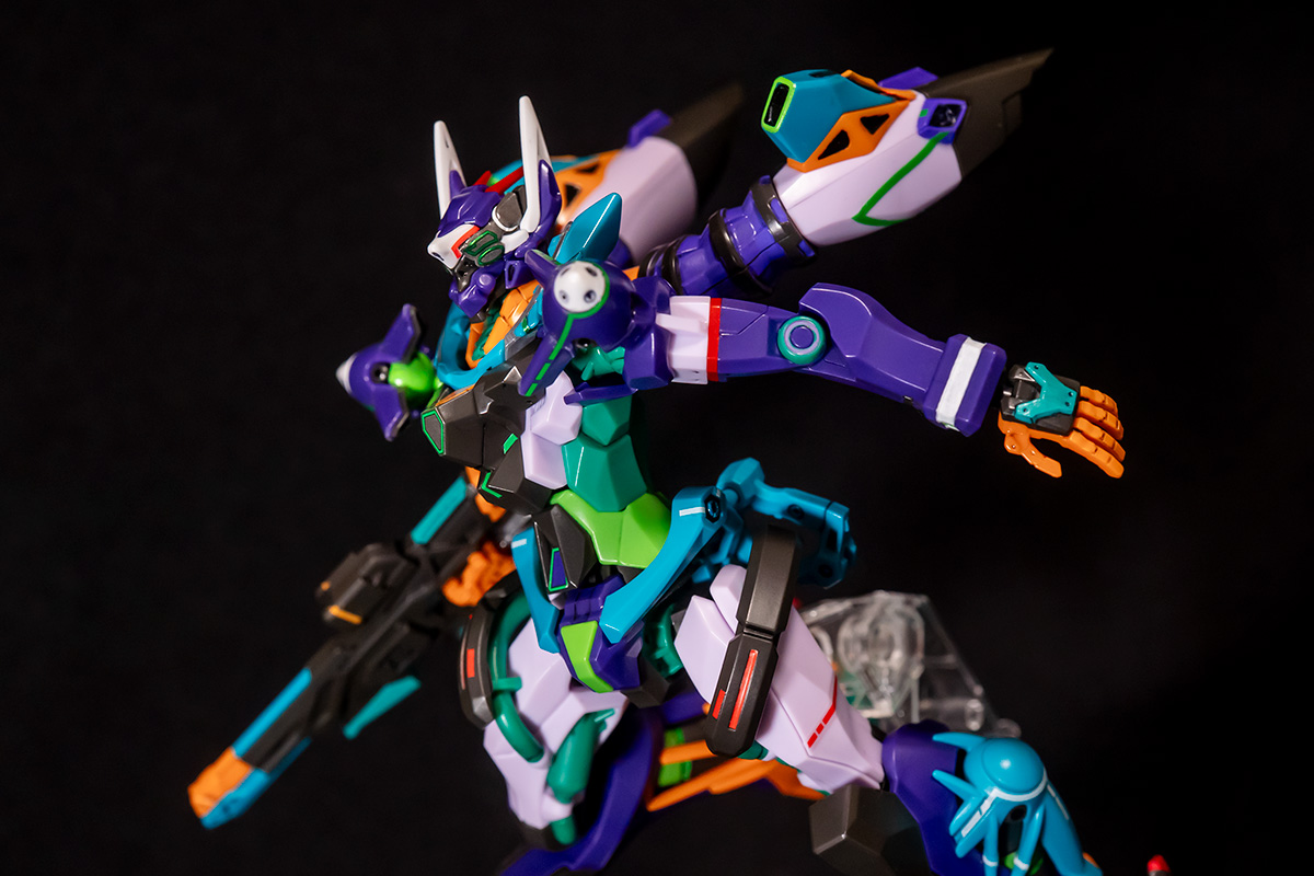 GQuuuuuuX の 2 号機 GFreD。劇中ではニャアンの乗機として物語後半に登場します。主役機と同型の 2 号機が敵方として登場するのはガンダム UC でもあった展開ではありますが、驚いたのはそのカラーリング。まるでエヴァンゲリオン初号機を彷彿とさせる紫×緑で、初めて GQuuuuuuX を見た時に感じた「エヴァっぽさ」がさらに強まっています。HG GQuuuuuuX の発売から初号機カラーに塗られたプラモの作例は多数見かけましたが、作中に公式でそれが出てくるとは思いませんでした。