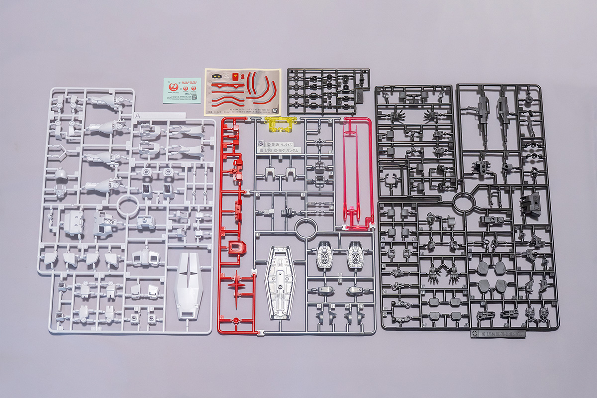 JAL オリジナルカラー Ver. とはいってもベースは HG ガンダム(REVIVE 版)の単なる色替えモデルなんでしょ?と高を括っていたら、箱を開けてビックリ。ランナーはポリキャップを除いてこれ専用の新規金型じゃないですか。各パーツの設計そのものは HG ガンダムのものを流用しつつ、色分けの都合で一部パーツは設計変更してランナー上に再配置されています。金型を起こしつつ JAL のロゴライセンスも乗っているとあれば値段が高いのも納得です。