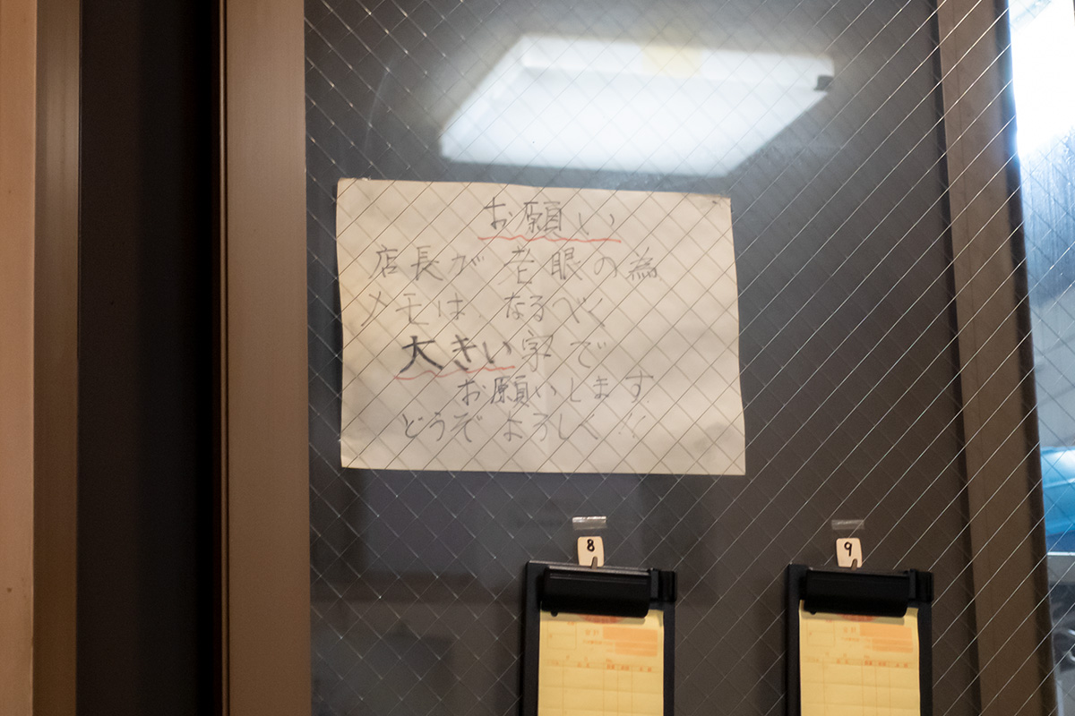 面白い貼り紙発見。この店は注文をメモ用紙に書いて提出する方式なのですが、店主が読めないからできるだけ大きな字で書いてほしいとのこと。
