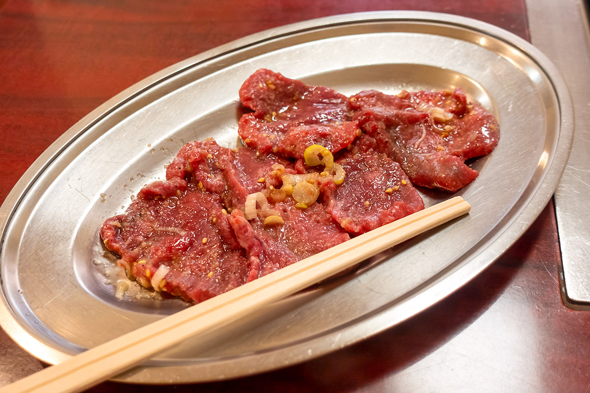 以前来たときに上タン塩とタン切落しみそ漬けは食べたことがあったけど、意外にも並タンは初めて。上タンとは違って赤身の部分を薄切りで。でも普通の焼肉屋で出てくるタン塩よりは分厚く見える。