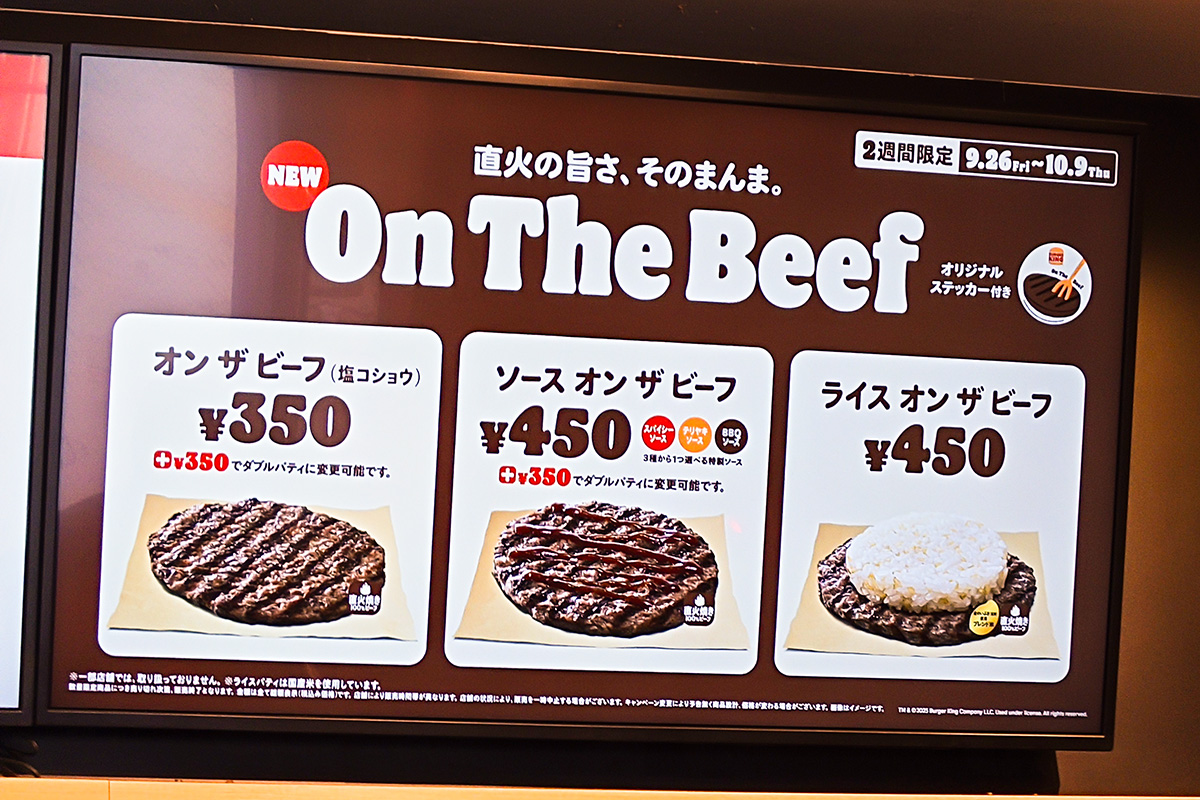 商品は直火焼きビーフパティにシンプルに塩コショウを振っただけの「オンザビーフ」、スパイシー/テリヤキ/BBQの三種のソースから選べる「ソースオンザビーフ」、そして大胆にもライスを載せた「ライスオンザビーフ」の三択。特にセットメニュー等も用意されていない異色の新商品です。