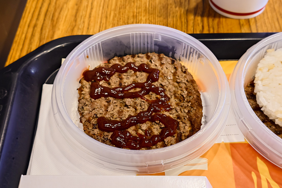 これ単品で食べるのは味も食感も単調なのがちょっとつらくて、やっぱりライスかバンズが欲しくなりますね。私は途中からこれをライスオンザビーフに載せて、ライスを肉で挟む逆ライスバーガー状態にして食べたらかなりうまかったです(笑