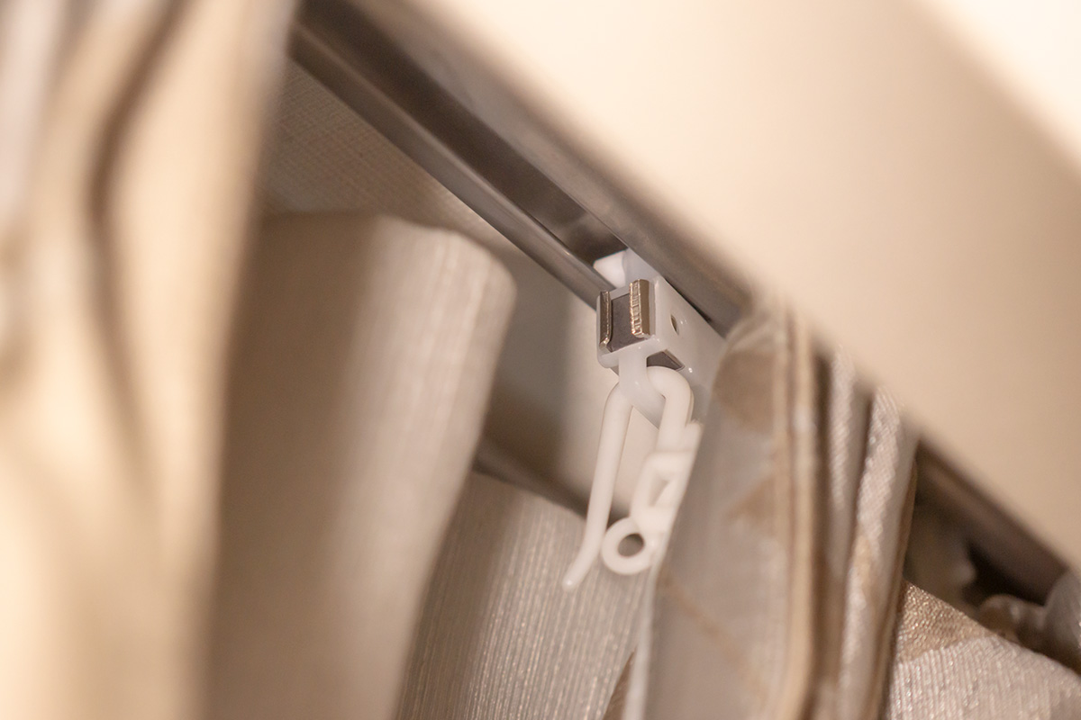 端っこの、二枚のカーテンの合わせ部分のランナー(滑車)がレールから脱落してフックが外れています。