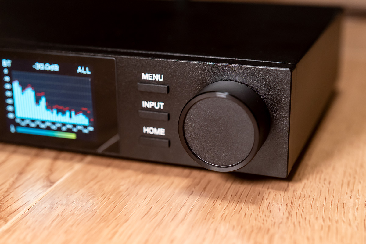 大きめのボリュームノブ。音量調節だけでなくメニュー操作や入力切換(ノブ押し込み)にも使うから操作感はかなり軽く、一定角度ごとにクリック感があるタイプ。