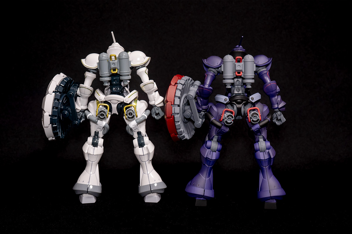 同じGQギャンでもカラーリングが違うだけで全然別モノに見える。光沢で仕上げたエグザベ機の特別感を際立たせたかったので、一般機は対照的につや消しで仕上げました。