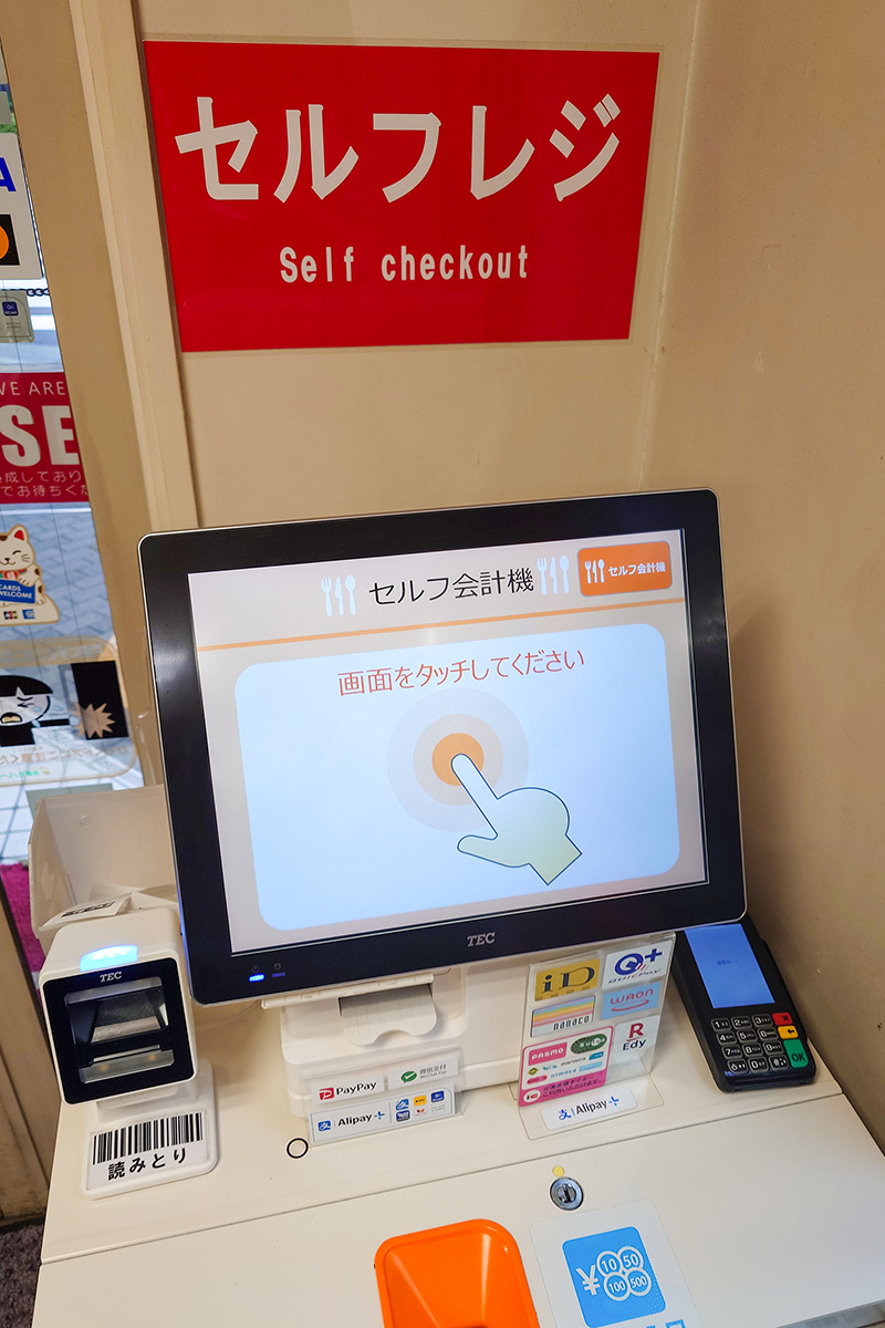 食べ終わったらセルフレジに伝票を読み込ませて電子マネーで支払い。徹底したセルフオペレーションです。