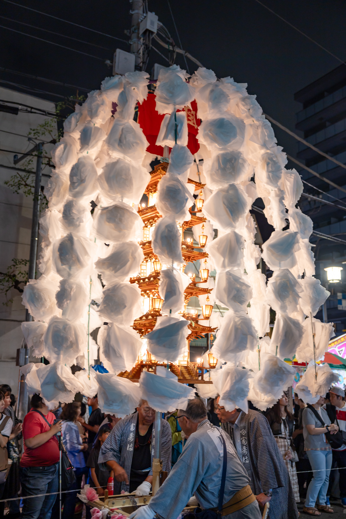 鳴り物のリズムは団体によってけっこう違うのに、入れ替わり立ち替わり流れてくるとシームレスに繋がって聞こえるのが不思議。さらにライトアップされた万灯やパフォーマー(纏)が練り歩く様子は、なんだかテーマパークのパレードっぽいなとも思ったり。歴史的な経緯を考えればむしろテーマパーク側がこういったお祭りを意識してパレードを作ったというのが正しいのでしょうが。
