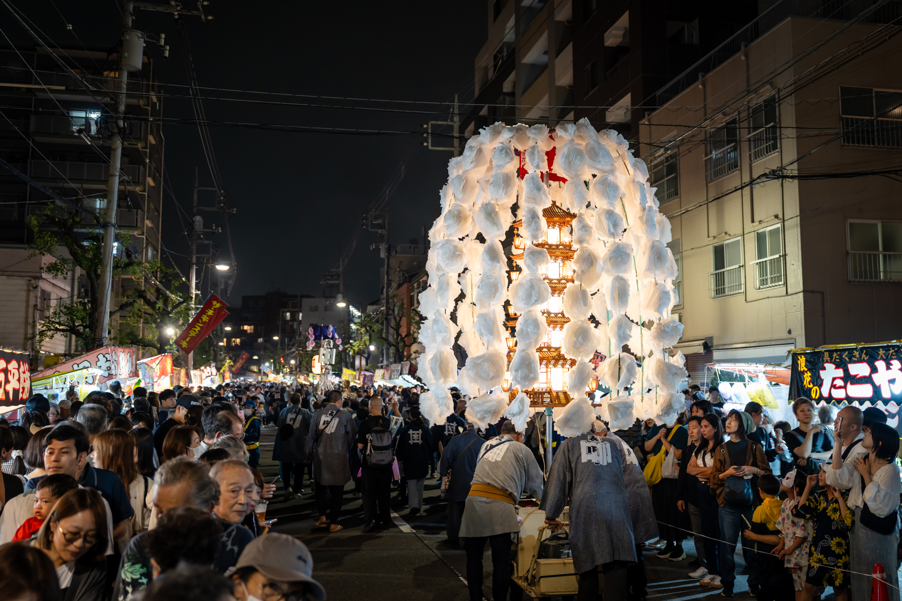 全国各地にある山車系のお祭りのような巨大さや豪快さはありませんが、宵闇の中白く照らされた万灯がゆっくりと参道を進んでいく姿は味があります。この万灯の形も色も団体によって千差万別なのもまた楽しい。