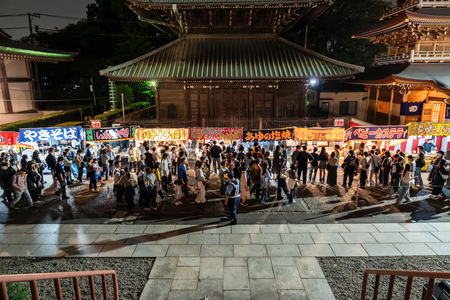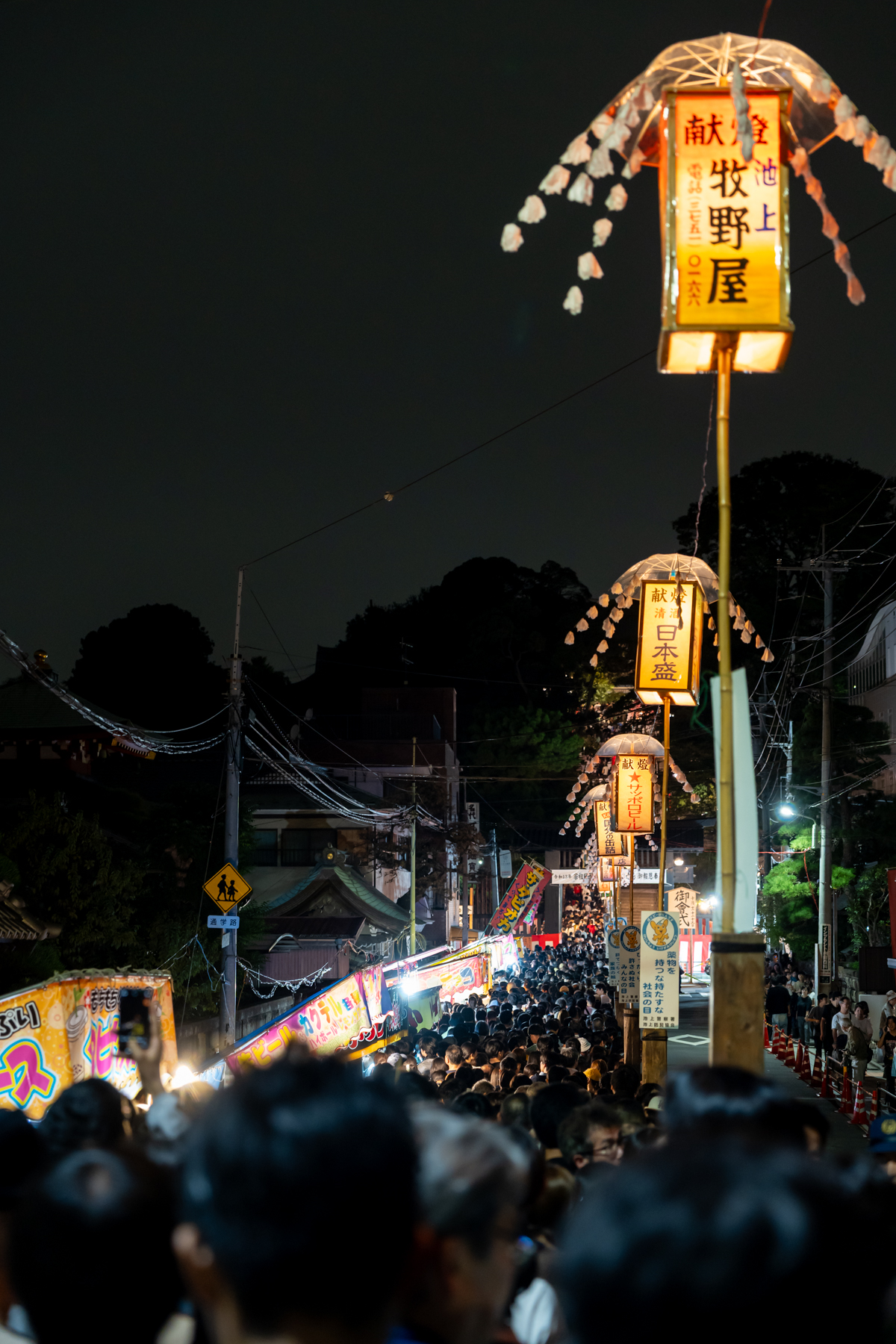会期三日間で三十万人が集まるという御会式のメインイベントだけあって、参道には歩くのも困難なくらい人が溢れています。この道路の右半分は万灯行列のために空けてあり、一般客は左側通行。人の流れは一応あるから待ち行列にイライラすることはないのですが、普段のこの場所を知っているとちょっとビックリするレベルの人出。