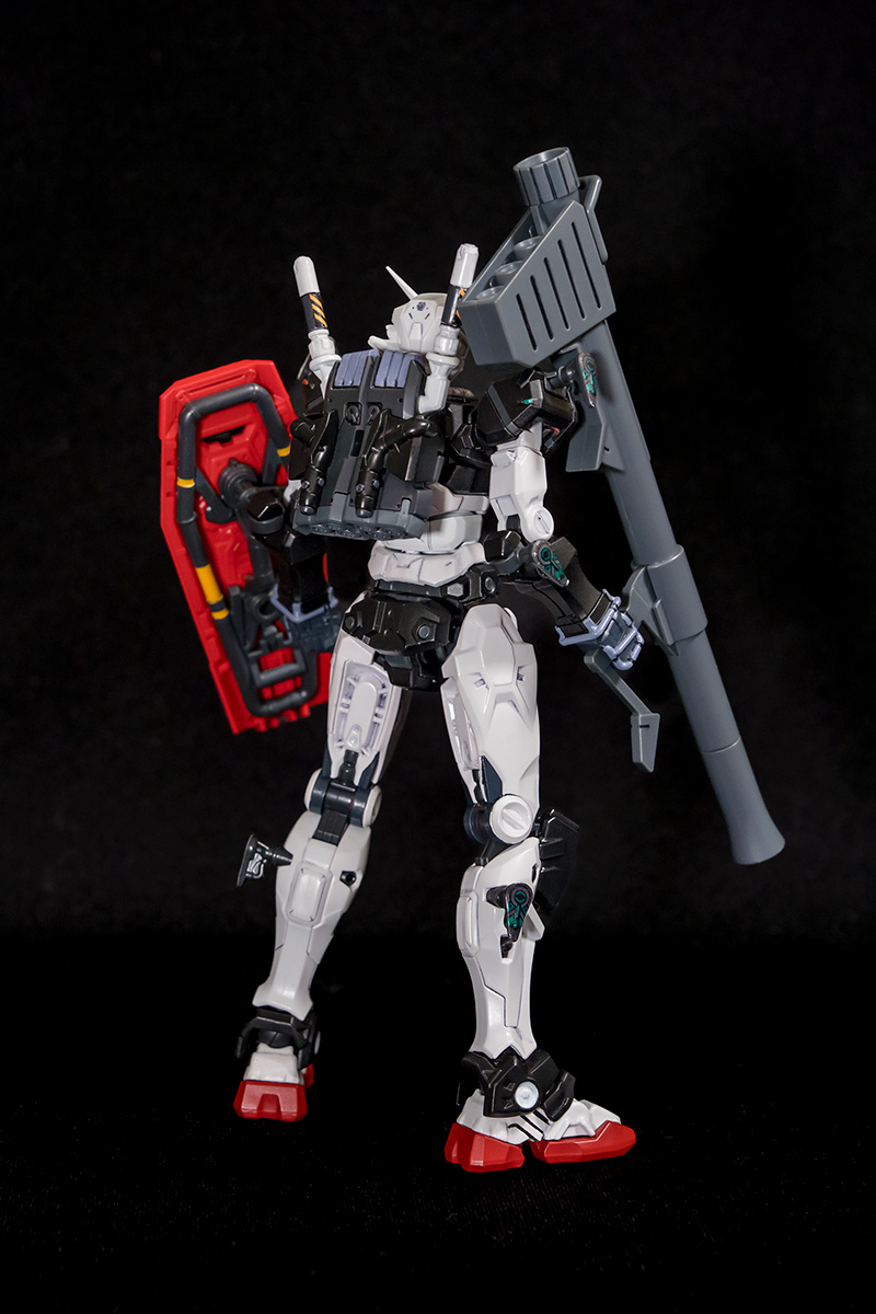 RX-78-01の制式番号や白黒に赤の差し色が入ったカラーリングは正史(MSV)のプロトタイプガンダムオマージュですね。頭部がツインアイセンサーではなくバイザー型なのはもしかするとTHE ORIGIN(コミック版)のガンダム試作1号機の要素かもしれません。そうすると軽キャノンのようにショルダーキャノン装備型のテストもしてたりしたのかな…と妄想が捗ります。