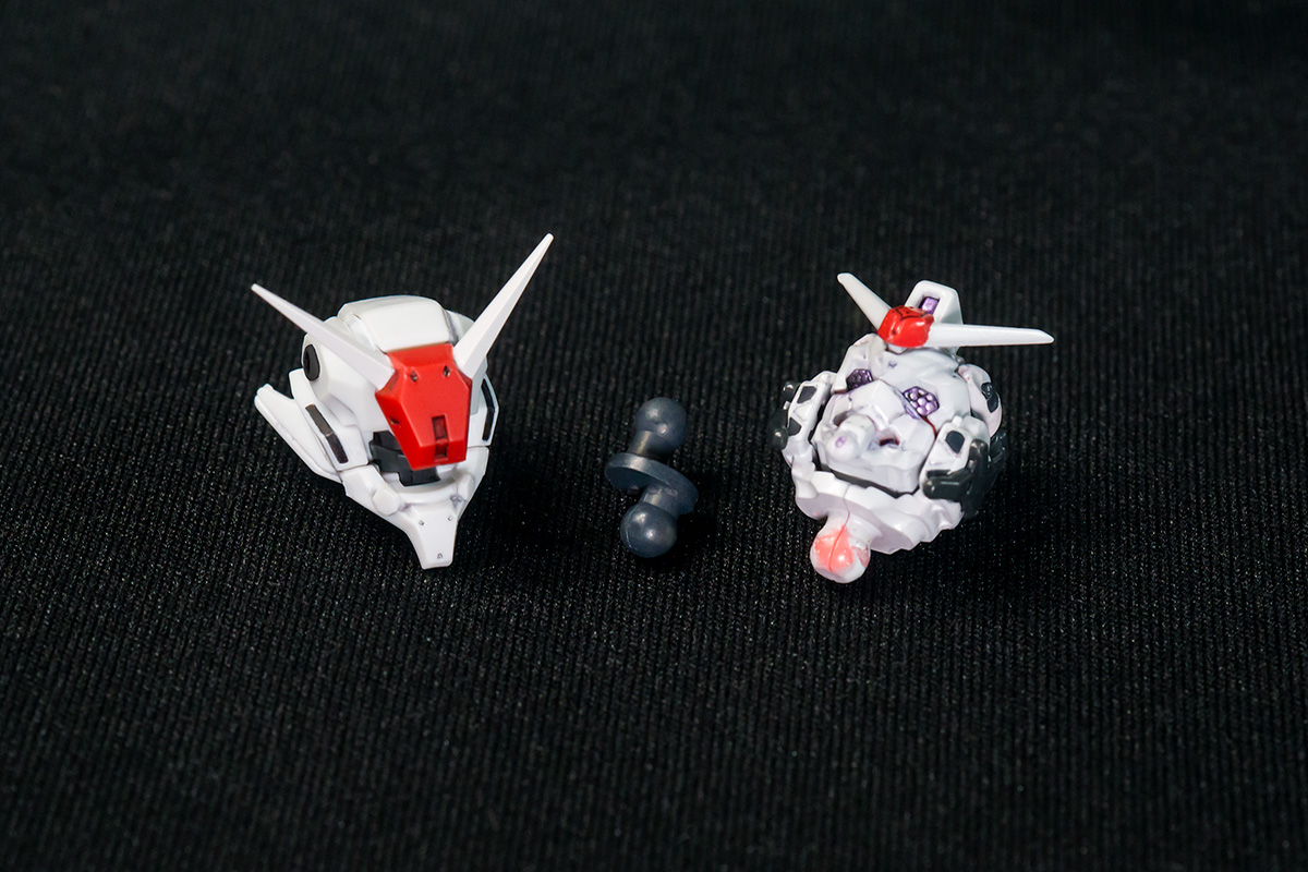 赤いガンダムにバイザーを破られてもなお四つのアイセンサーを光らせて斬りかかってくるシーンの再現。ここカッコ良かったですよね。