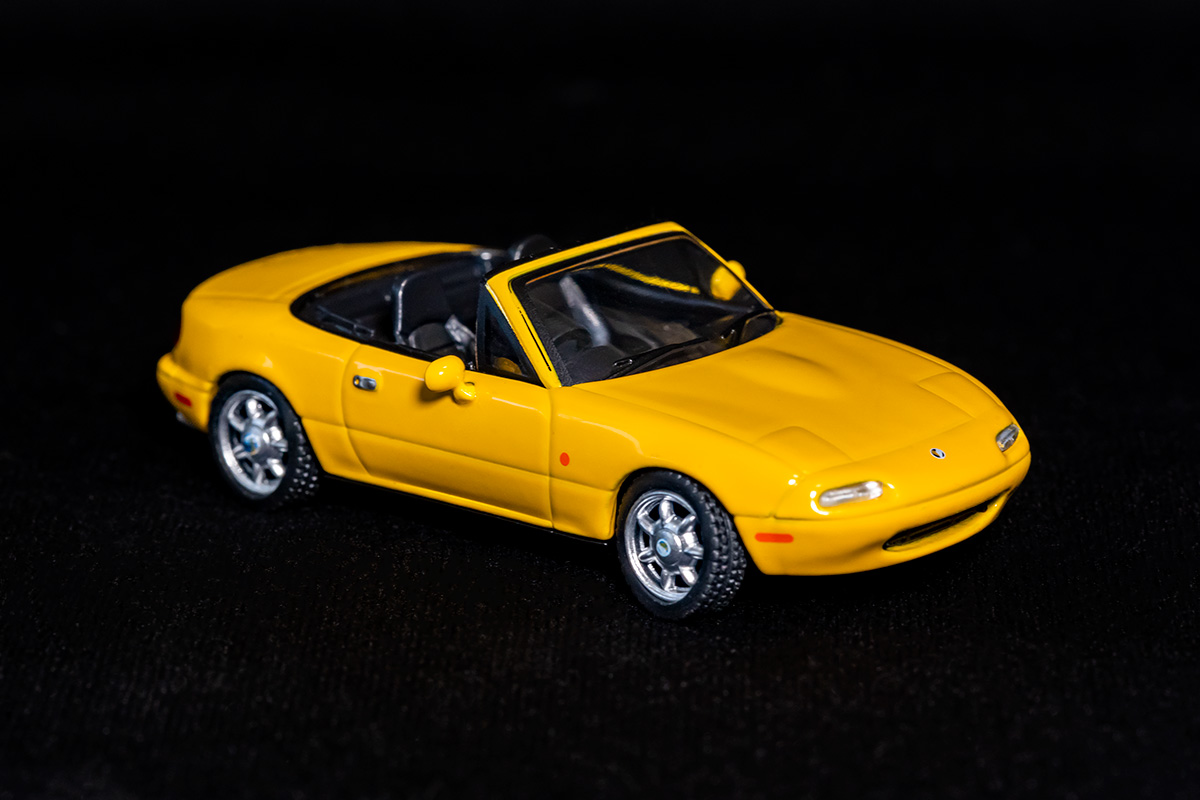 こちらはマツダのサンバーストイエロー同士。ミニカーのメーカーが異なるので見比べると黄色の発色が微妙に違うのですが、写真だと飽和しがちな色であることもあって違いが出にくい。でも塗膜の厚さが全然違うことは一見して分かります。