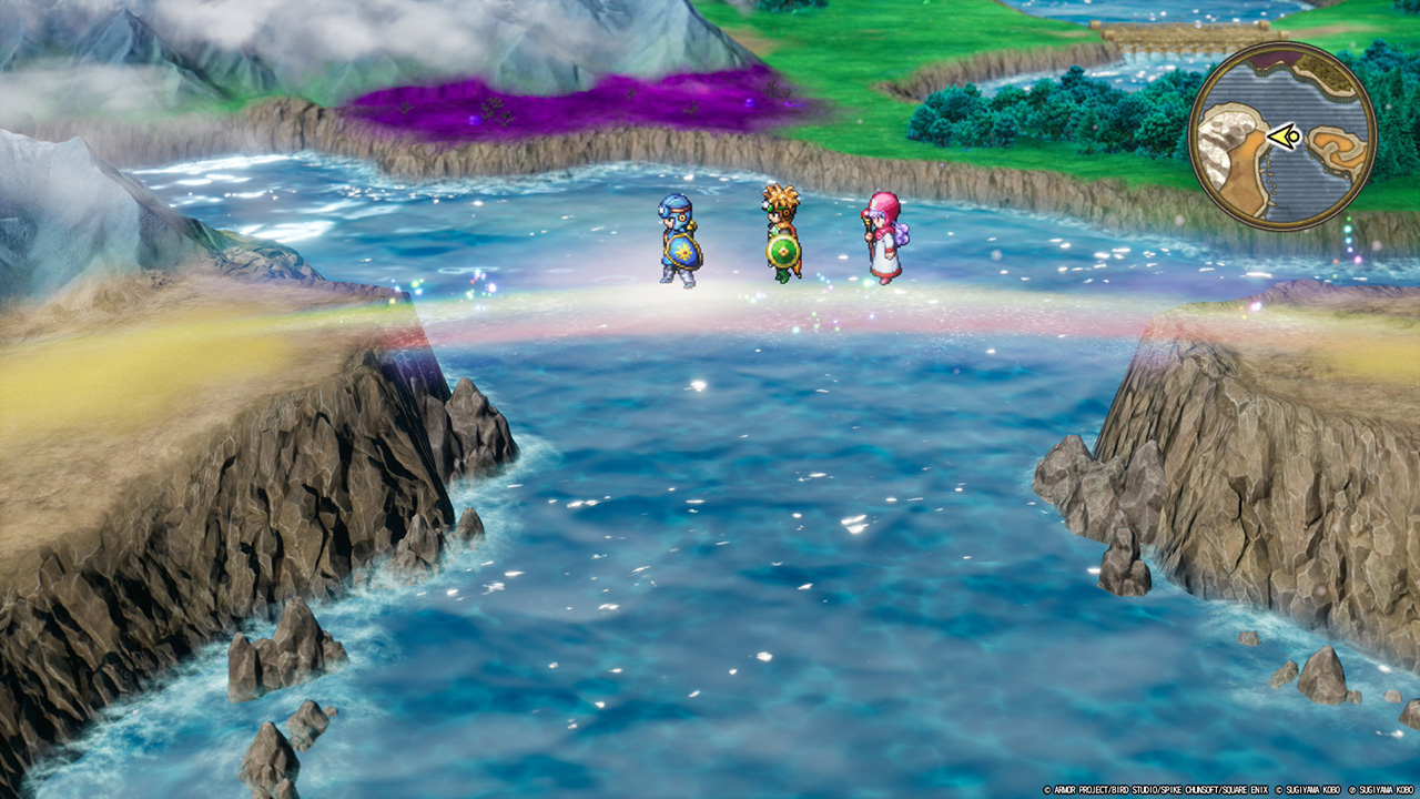 FC版では最初から架かっていた橋は本作ではなくなっており、ラダトーム王から受け取った「虹のしずく」で改めて虹の橋を架けて島へと渡ることになります。雨雲の杖と太陽の石から集めさせられなくて少しホッとしました。