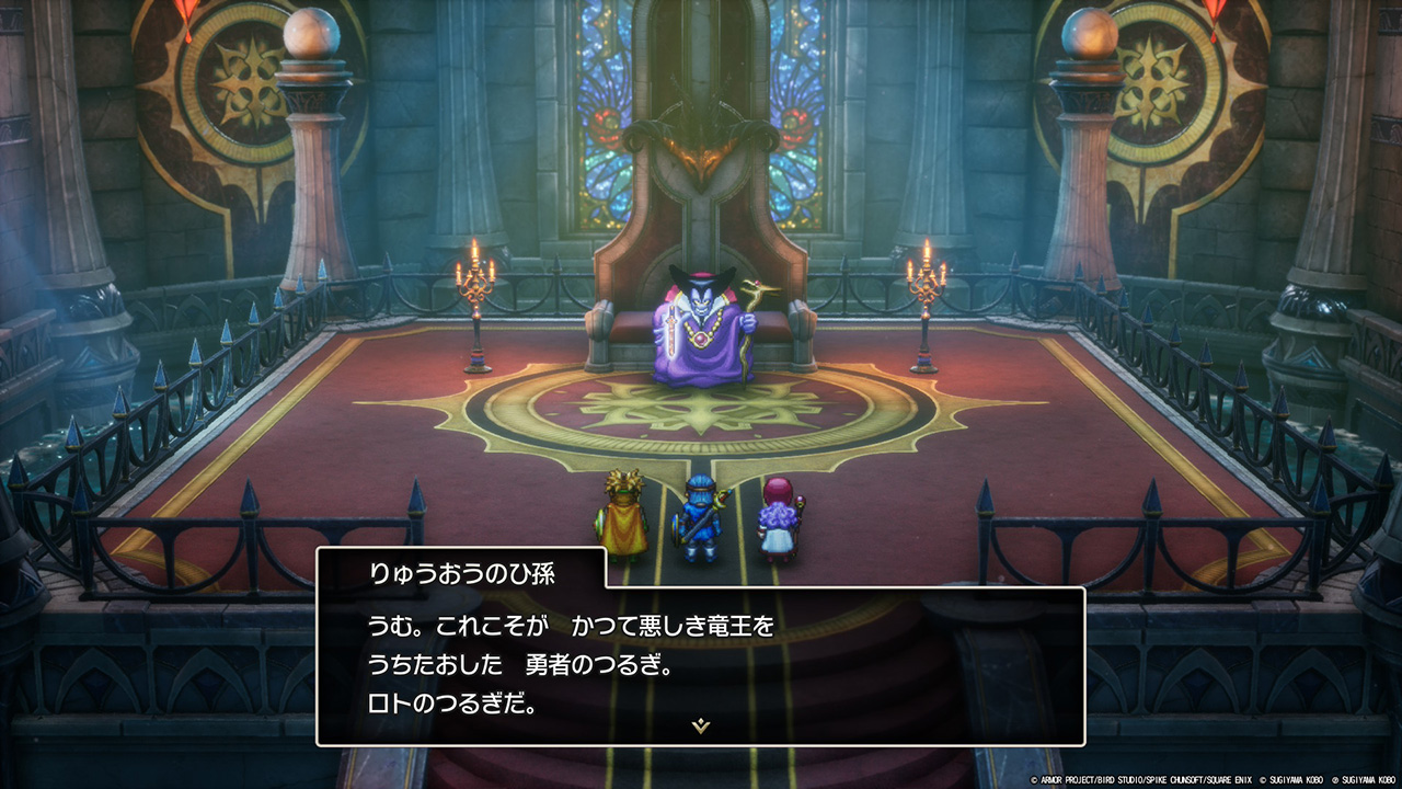 そして竜王のひ孫はロトの子孫たちに錆びた「ロトの剣」を与えます。FC版では何故か竜王の城の宝箱に入っていたロトの剣。Iで竜王を倒したはずの勇者が何故この城に剣を残していったのか?謎だったのですが、HD-2D版では「Iの勇者が竜王を倒した際にロトの剣を竜王に突き立てたまま残していった」という演出が追加されており、そのひ孫がロトの子孫に剣を返す、という流れに変更されたわけです。こういう後付けの辻褄合わせだけど前後関係がスッキリ繋がる改変、好き(笑