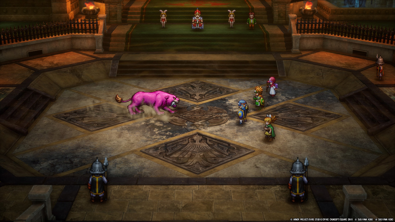 続いてデルコンダルへ。もちろん王の前でモンスターとの御前試合を行うわけです。オリジナルとの違いはキラータイガー1戦ではなく3回に分かれたモンスター戦(最後がキラータイガー)になっていること。でもここまで来たパーティーならば特に苦もなく制して「月の紋章」をゲット。