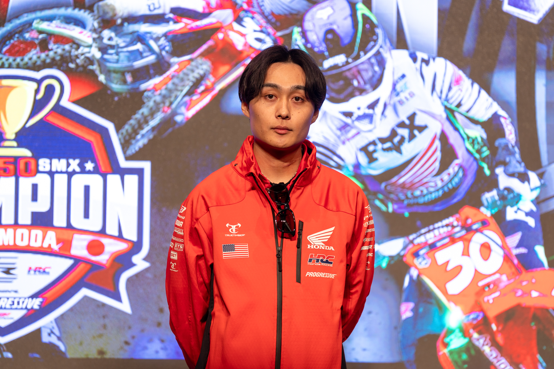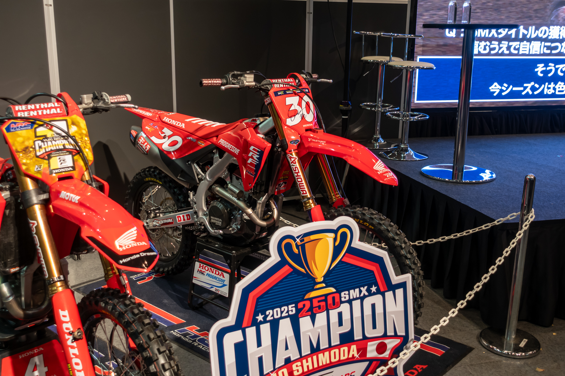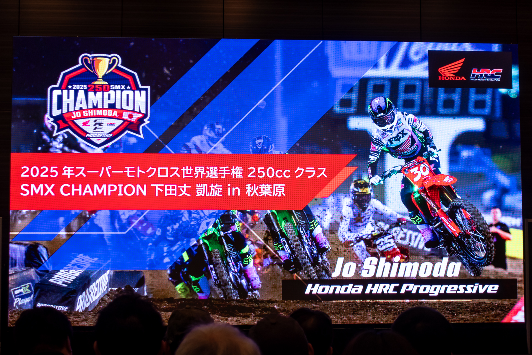 今シーズン、スーパーモトクロス世界選手権(SMX)の250ccクラスでチャンピオンに輝き、またその成果が認められ先日の内閣総理大臣杯 日本プロスポーツ大賞で敢闘賞を受賞したことを記念しての凱旋イベントでした。12月に入ってからの告知で急遽決まったっぽい雰囲気。通常ならば青山のホンダ本社ショールームでやるところでしょうが、本社は現在建て替え中ですからね。