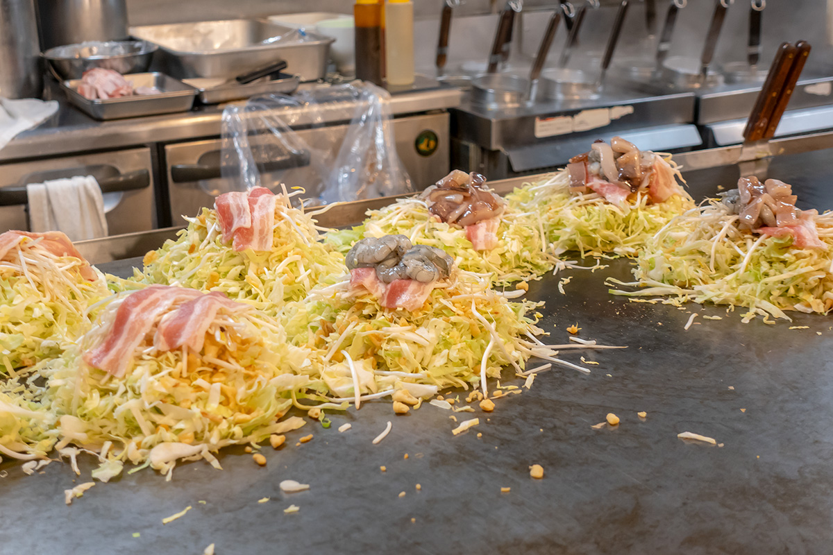 広島のお好み焼きはこうやって生地をうすーく焼いていくんですよね。初手はお好み焼きっていうよりもクレープを焼いているように見えます。