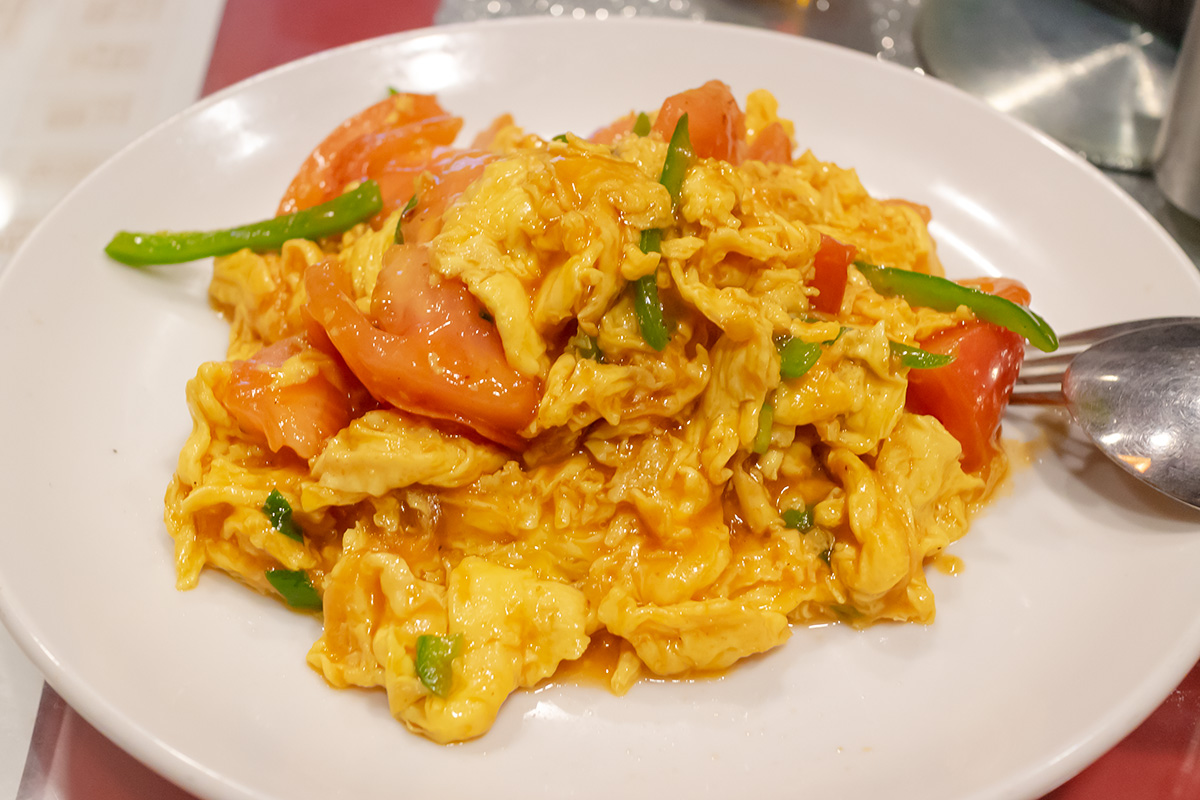 卵とトマトの炒め。中国家庭料理の定番ですね。