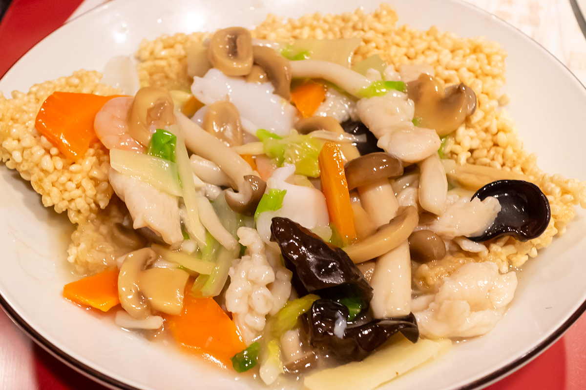せっかくだからもう一品追加で海鮮おこげ。目の前であんかけをジュワーッとやってくれるライブ感。
