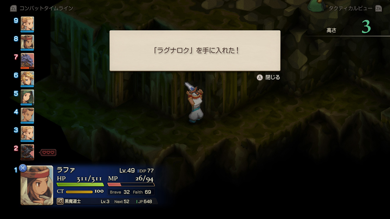 アイテムはノーマル(ほとんどがフェニックスの尾)とレア(最強系装備またはエリクサー)のランダムで、ユニットのBraveが低いほどレアを引きやすい仕様。でも今回のリメイクでは戦闘中のオートセーブからロードすることで実質的にリセマラできてしまうため、オリジナル版よりもレア装備の発掘は簡単になりました。