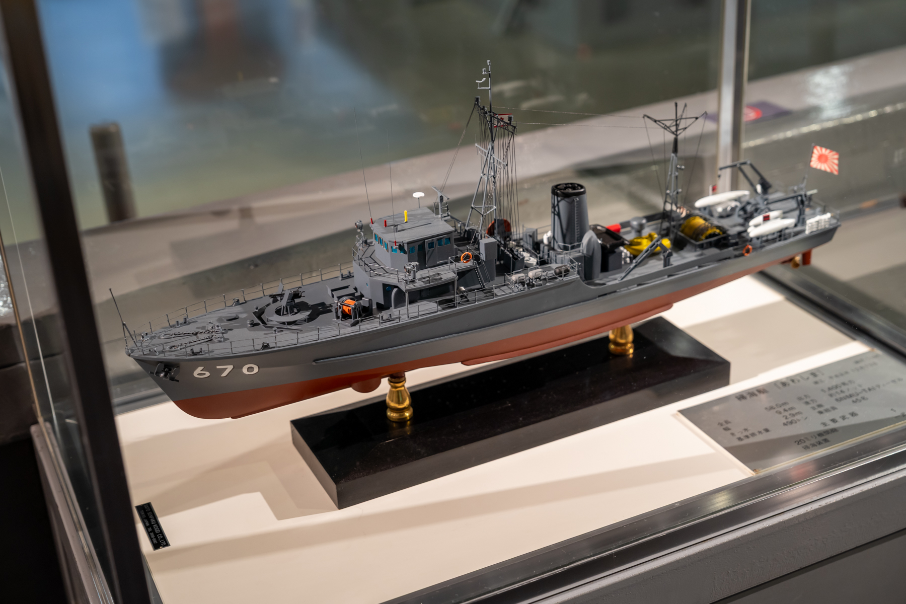 機雷除去作業を担う掃海艇「あわしま」の模型。