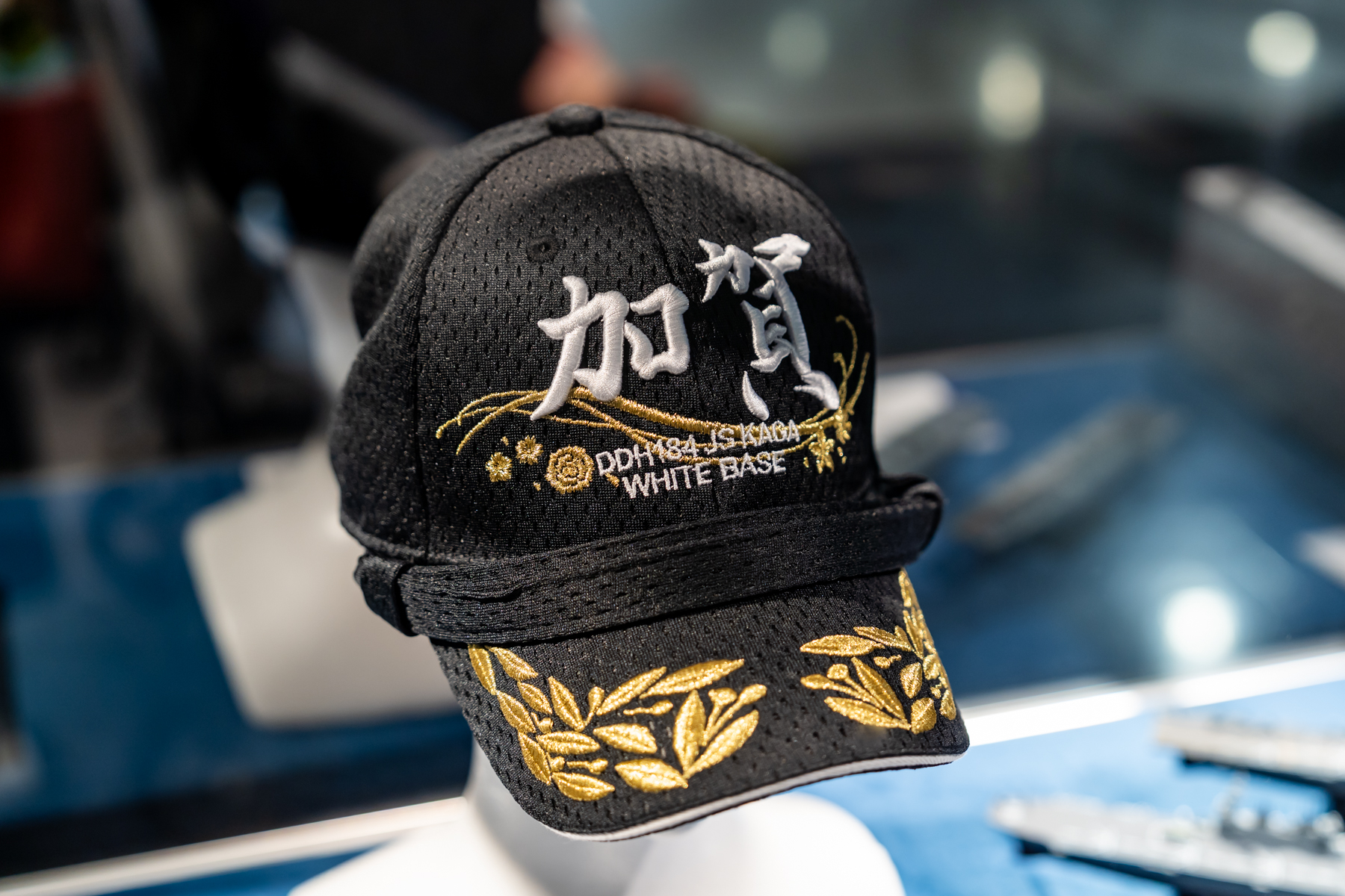 ちょっと面白かったのが護衛艦関連の展示。これは海上自衛隊を代表する護衛艦「かが」のものですが、デザインといい刺繍といいすごく凝ってる。