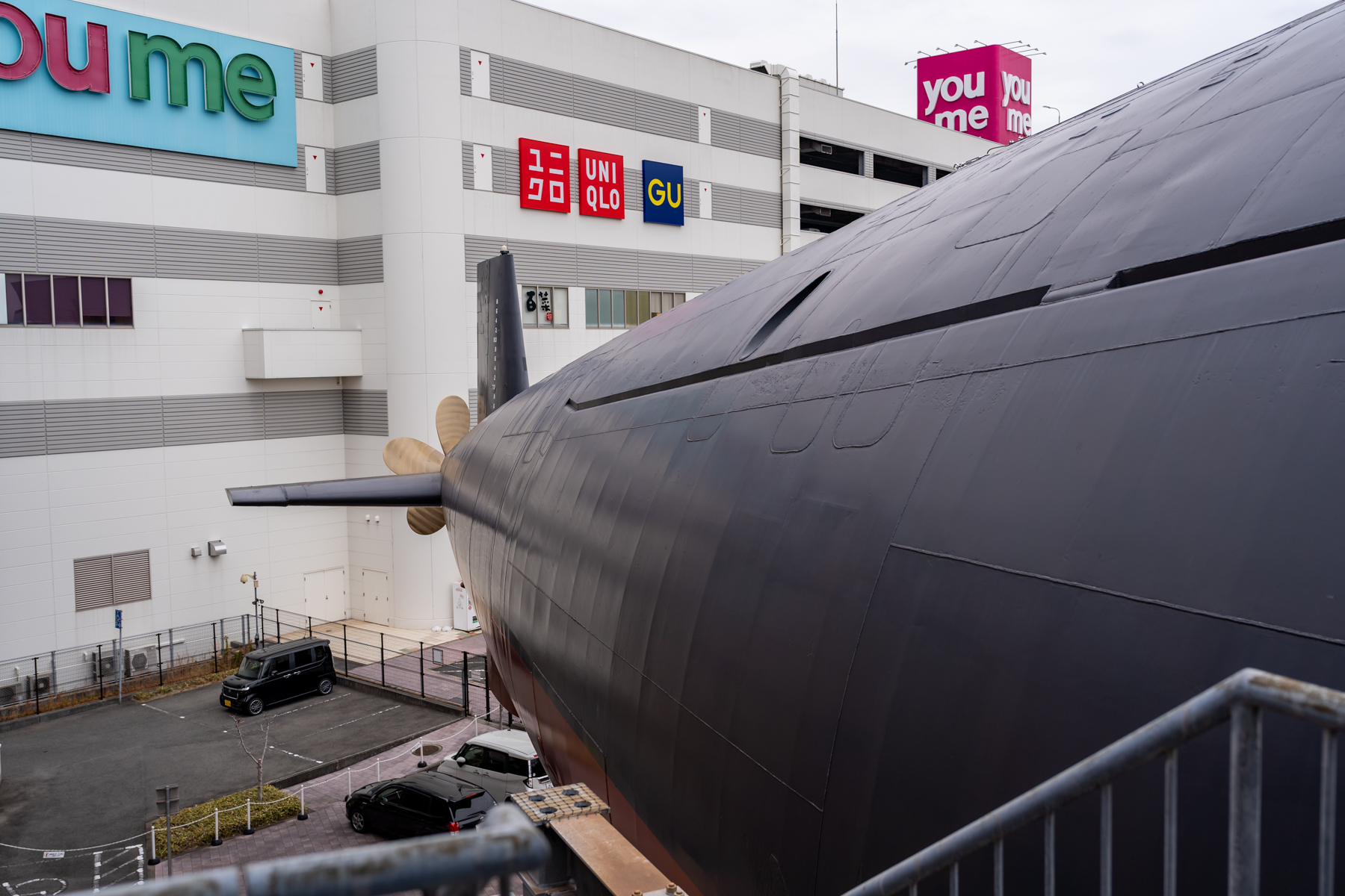 そしてひとしきり見学したところで直結する潜水艦「あきしお」の見学に移るわけです。どこの街にもあるようなショッピングモール(イオンみたいな感じか)のすぐ横に潜水艦がある景色はさすがに異様。