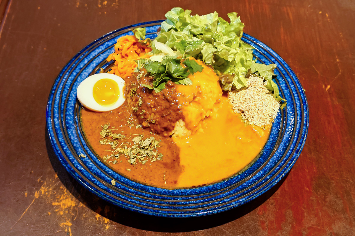 左半分はスパイスカリー。名前とは裏腹にスパイス一辺倒ではなく日本のカレーのようなコクを兼ね備えたタイプで私好み。でも普通のジャパニーズカレーにはない多様なスパイスの刺激が感じられる。カレー欲をストレートに満たしてくれるカレー。
