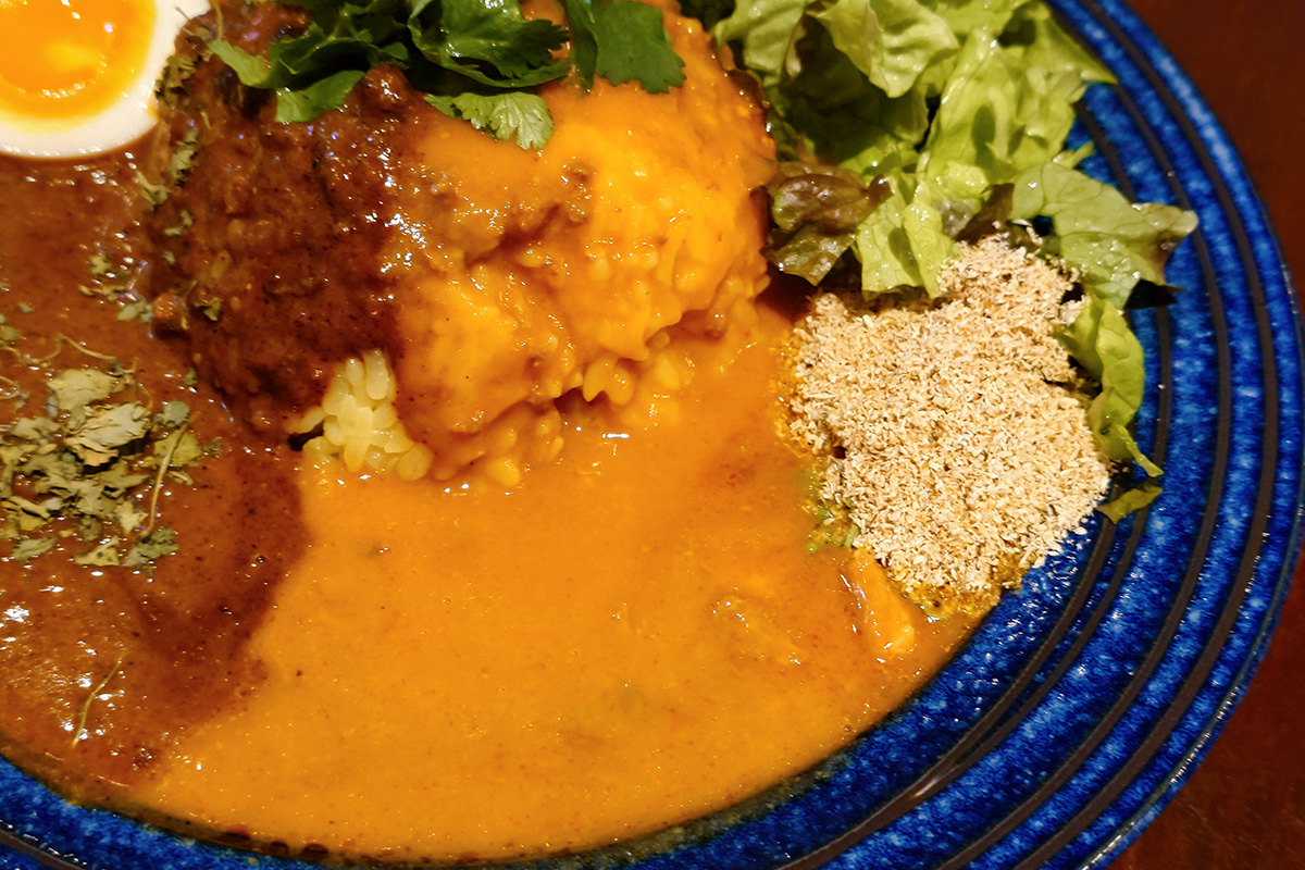 端っこに振りかけられているのは魚粉?ラーメンじゃなくてカレーに魚粉って珍しいと思ったら、これは魚粉やココナッツパウダーを混ぜ合わせて作ったサンボルなんですね。確かにスパイスカレー系の店では時折見かけます。これを混ぜるとカレーに魚介っぽい風味がプラスされてなかなかイケル。