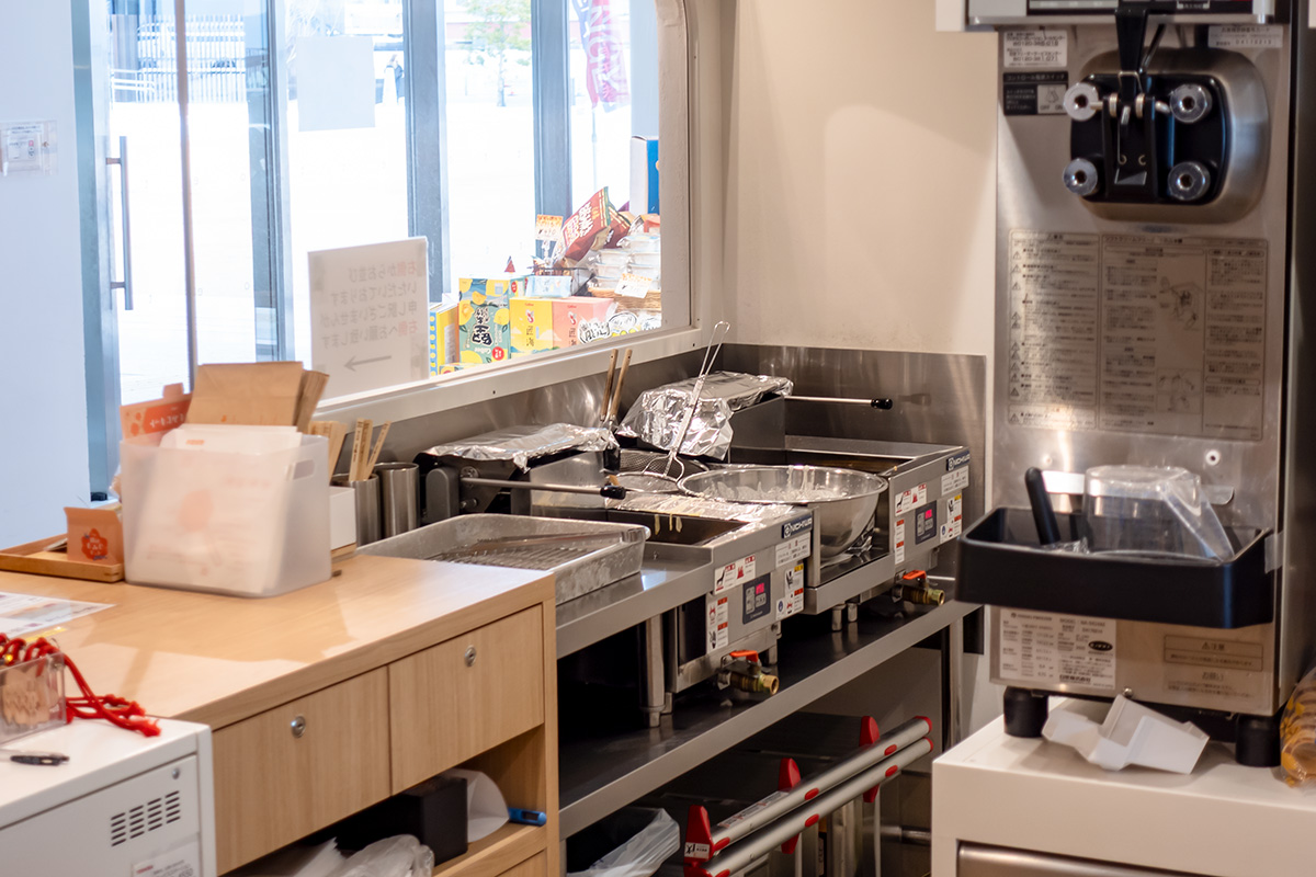 厨房に目をやるとフライヤーが二基稼動していました。本来紅葉饅頭のお店とは思えない、むしろファストフード店か何かのような(笑。