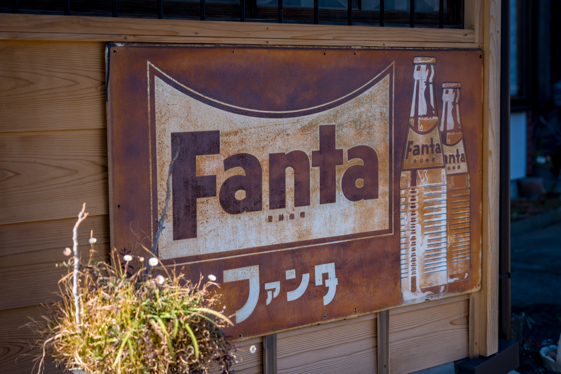 いかにも昭和なホーロー看板!しかもこのファンタのロゴは私も知らない時代(五十年以上前)のものですね。当時からある建物には見えなかったので改築しても看板だけ残しているのか、それとも他から移してきたのか。
