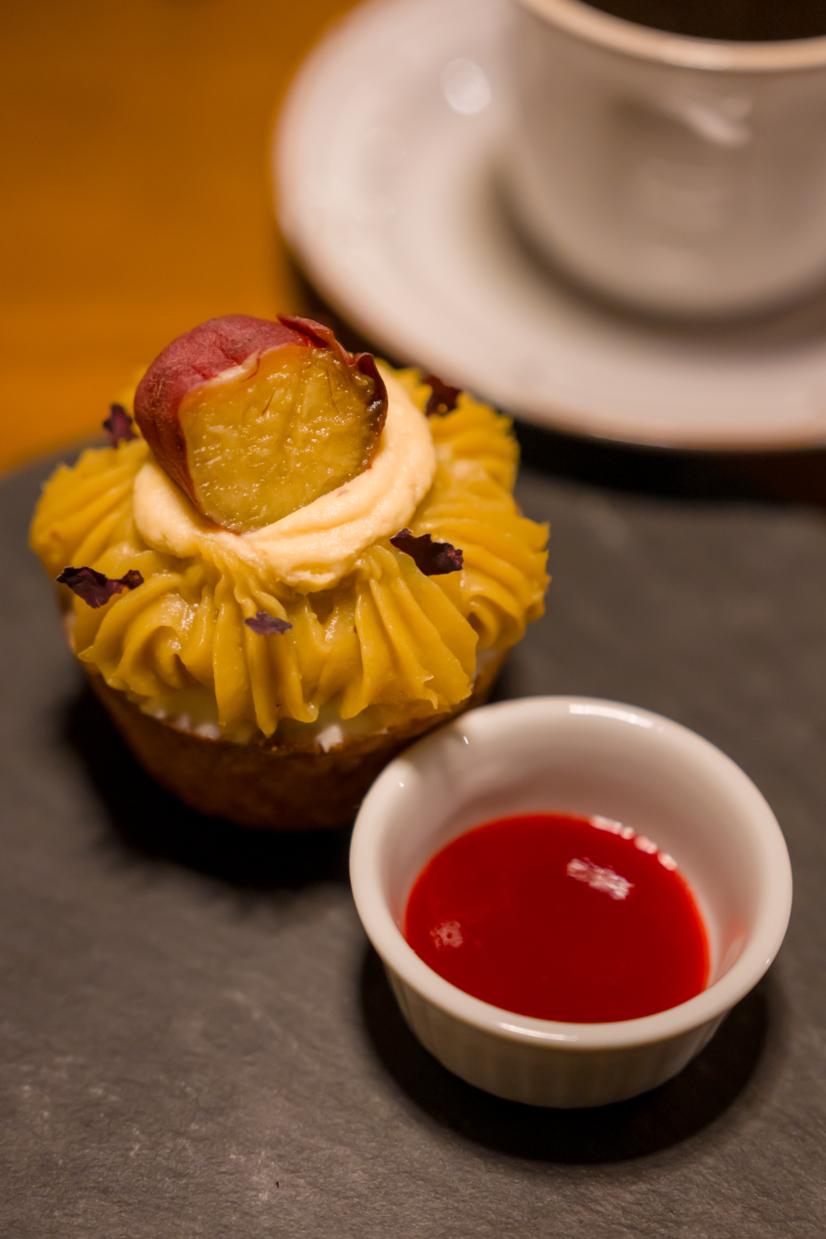ちょっと歩き疲れたところで通りすがりにあった金蜜堂というお店に入ってみました。金蜜芋とそれを使ったスイーツを出す店で、このチーズタルトが絶品でした。蜜芋の濃密…むしろ「濃蜜」と呼びたくなる香りと甘さを上品に引き出しつつも、素材の味だけに頼らず絶妙なバランスにまとめてある。丁寧な仕事ぶりが味から伝わってきます。もう一度佐原に来ることがあったらまた食べに来たいくらいに気に入りました。
