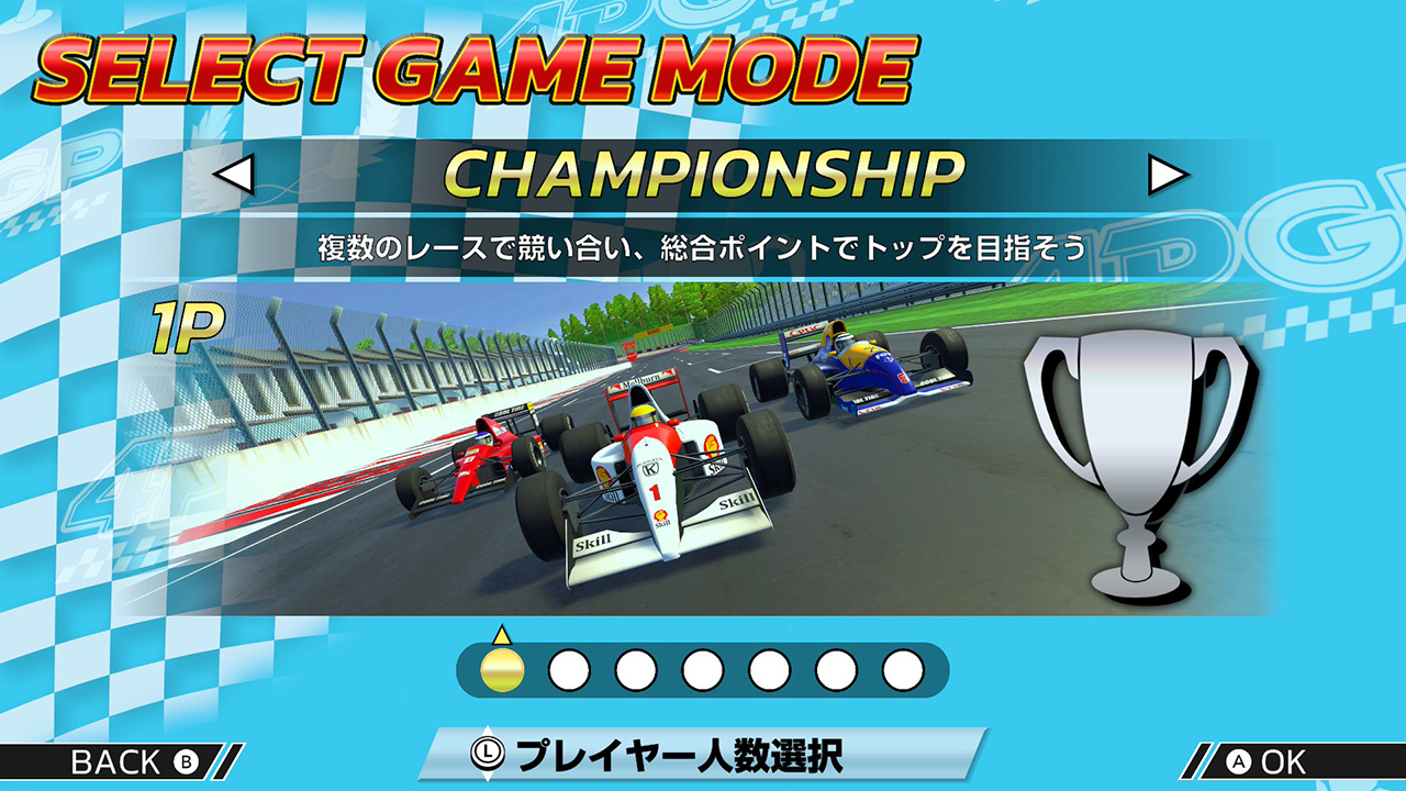 ゲームモードはチャンピオンシップ、クイックレース(シングルレース)、タイムアタックの3種類。