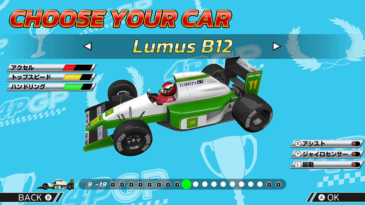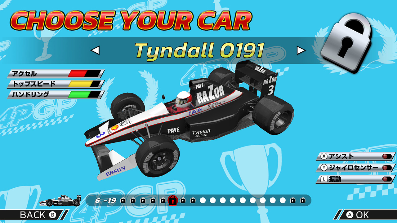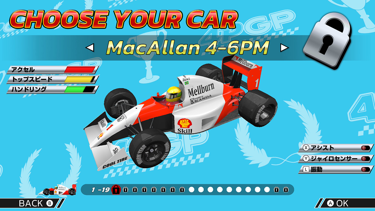 なお上位チームのマシンはゲーム開始時点ではロックされていて、条件(特定のサーキットやチャンピオンシップで優勝など)をクリアするごとに解放されていきます。