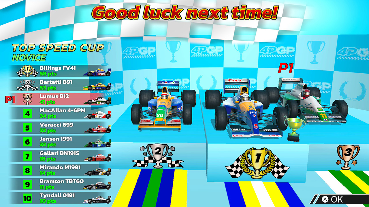 チャンピオンシップモードもかなり簡易的で実際のF1のような10レース以上を戦うようなものではなく、特定のテーマに基づく3つのコースを連戦して獲得ポイントを競うシステム。かつ、それぞれのカップごとに難易度が選択できます。でもレースゲームとしてはバランスが悪くてノービス(初心者)でも勝つことは簡単ではありません。