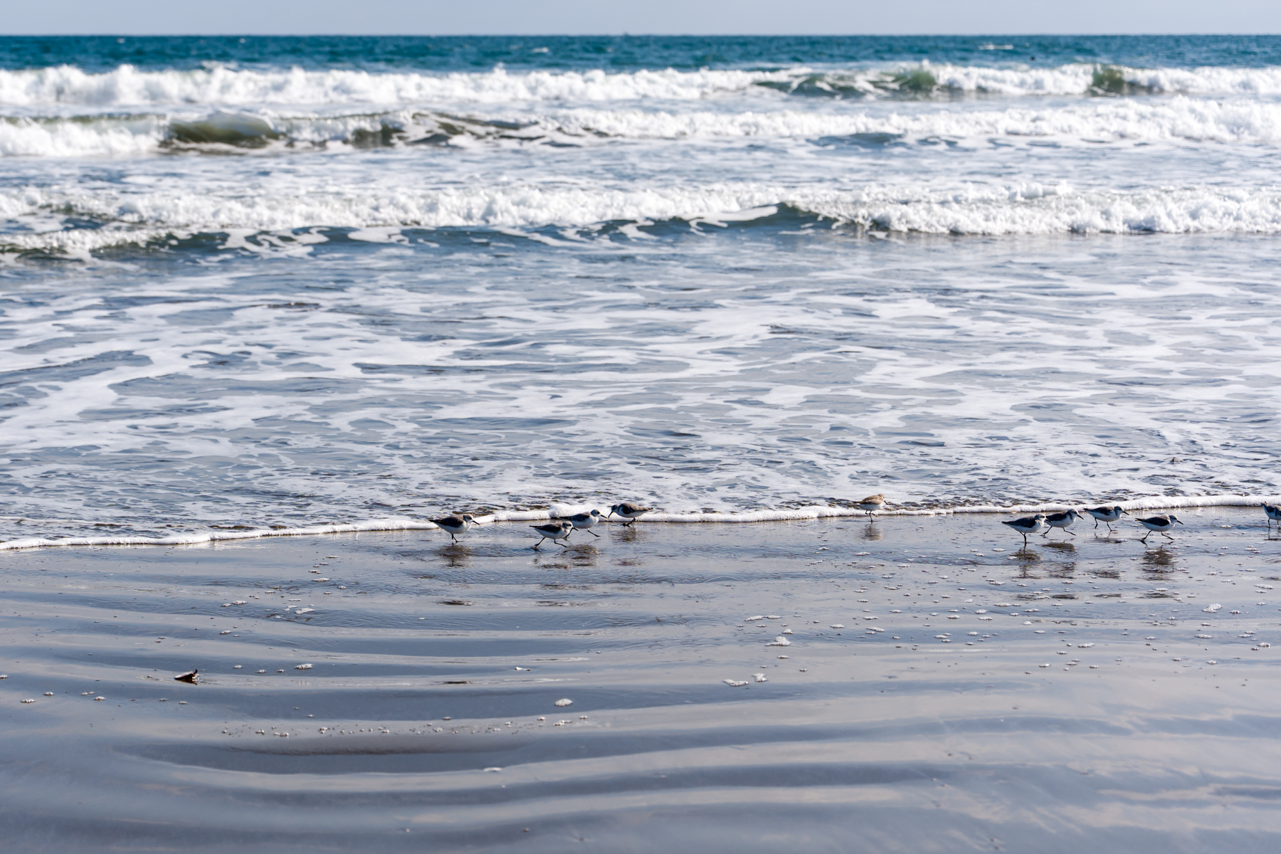 波と戯れる浜千鳥の群れ。本当は波に運ばれてくる虫や貝を捕食しているのでしょうが、波が寄せてきたら脚を細かく動かしながら逃げ、引いたら急いで奥に侵入を繰り返すさまは遊んでいるように見える。とても愛らしくて永遠に見てられます。