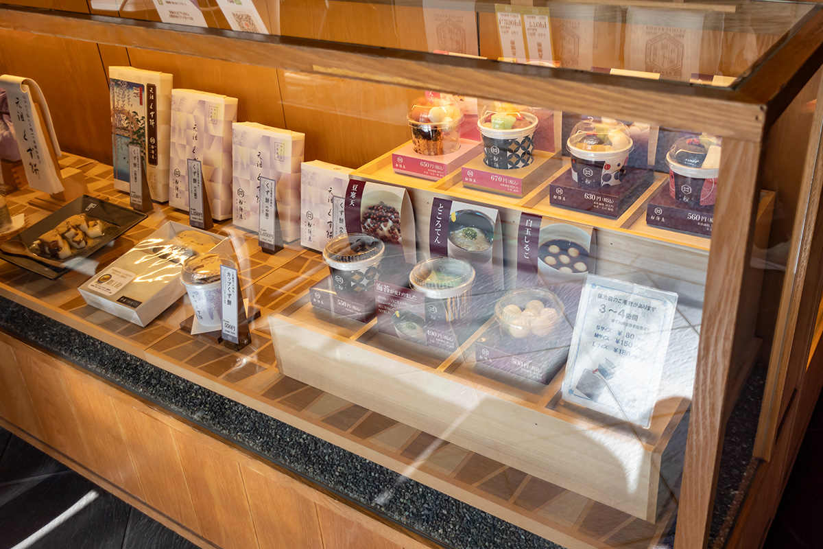 持ち帰りメニュー。くず餅をはじめとしてところてんや白玉しるこもテイクアウトできます。店内は混んでるので、自宅が近所だったらここで買って帰って好きな飲み物と一緒にいただくのも良さそう。