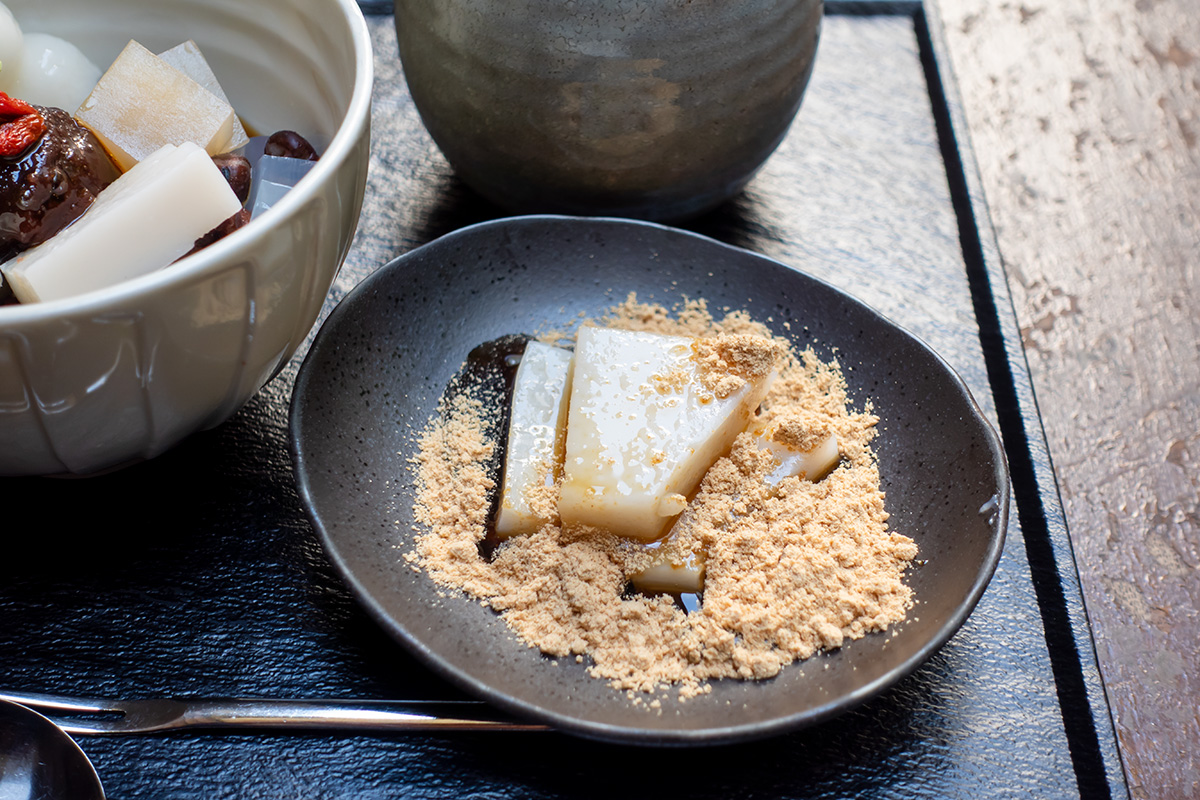 くず餅って味においてはそれ自体よりも黒蜜ときなこが主役というイメージがあるけど、黒蜜ときなこだけ食べてもそんなに楽しくないし、同じような組み合わせでも甲斐の信玄餅ともまた味わいが違う。なんだかんだ言ってくず餅自体の存在感が重要なんだなあ…というのをしみじみと感じます。