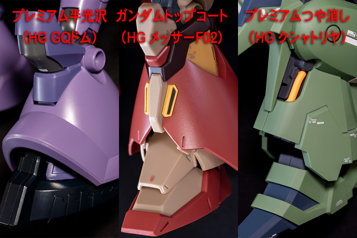 プレミアムトップコートの半光沢・つや消しと比較してみるとこんな感じ。同じキットでの比較ができないのでサイズ感の近いキットで比較。