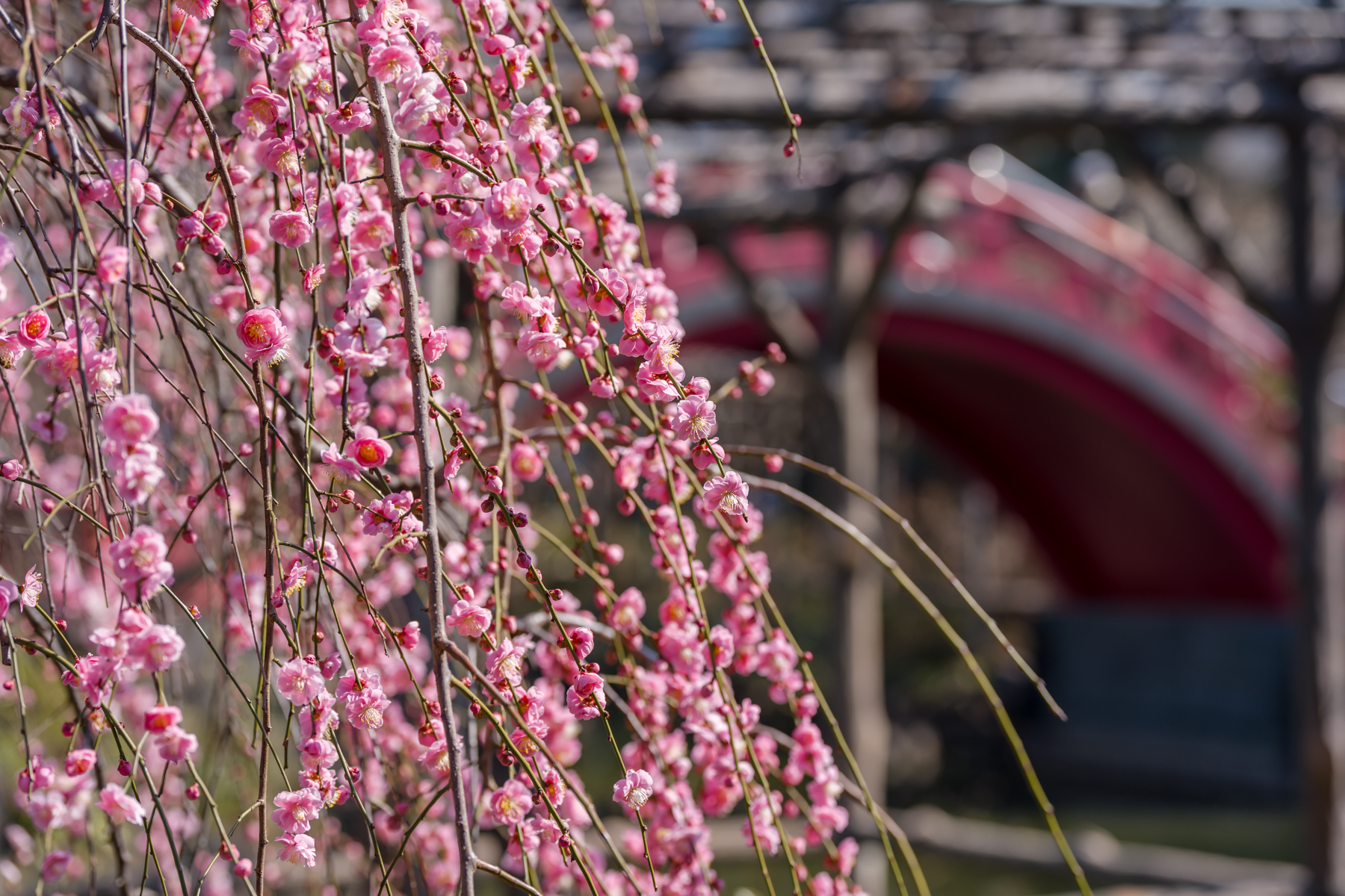 庭内にある何本かの枝垂梅にはどれも人だかりができていました。スマホカメラを使って近接撮影しようとする人が多いから中望遠で撮りたい私としてはちょっと辛い…。