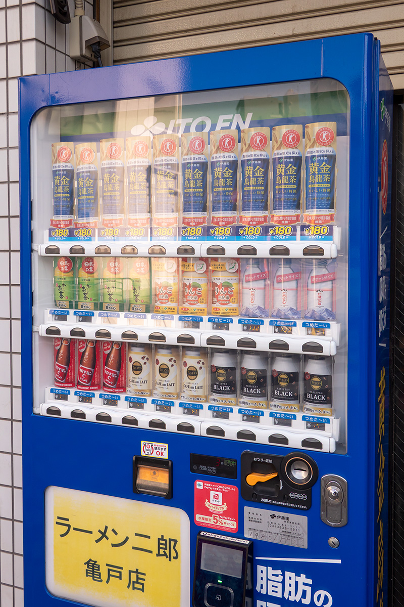 亀戸二郎は飲み物が持ち込み自由で、店前にも持ち込み向けの自販機が設置されています。脂分やニンニクの中和に適した飲み物を揃えているところがわかっていらっしゃる。