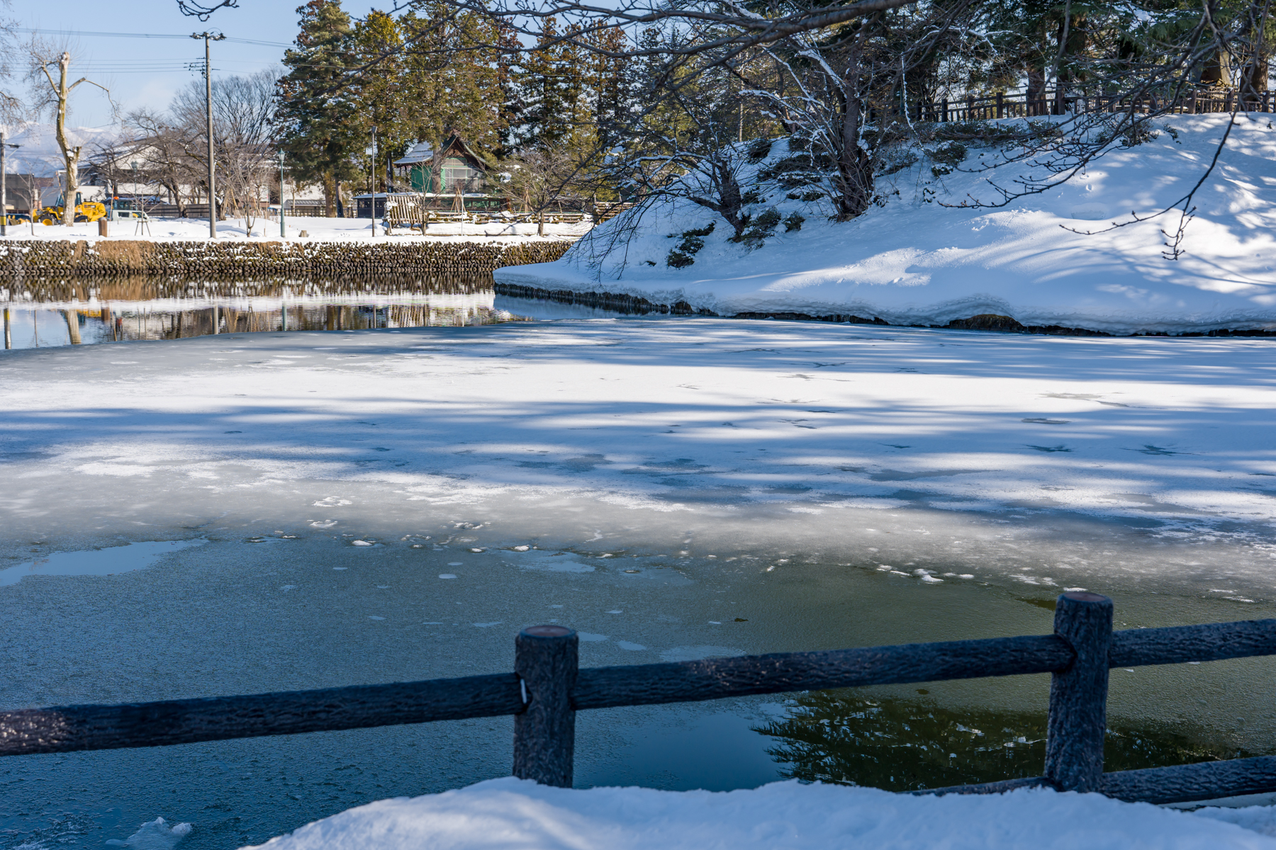 城跡だから神社の周囲にはお濠が残っているわけですが、水面が凍結しているのもまた冬らしさ。暖かい季節にはきっと水鳥たちもいるだろうに、今は完全に冬のそれ。