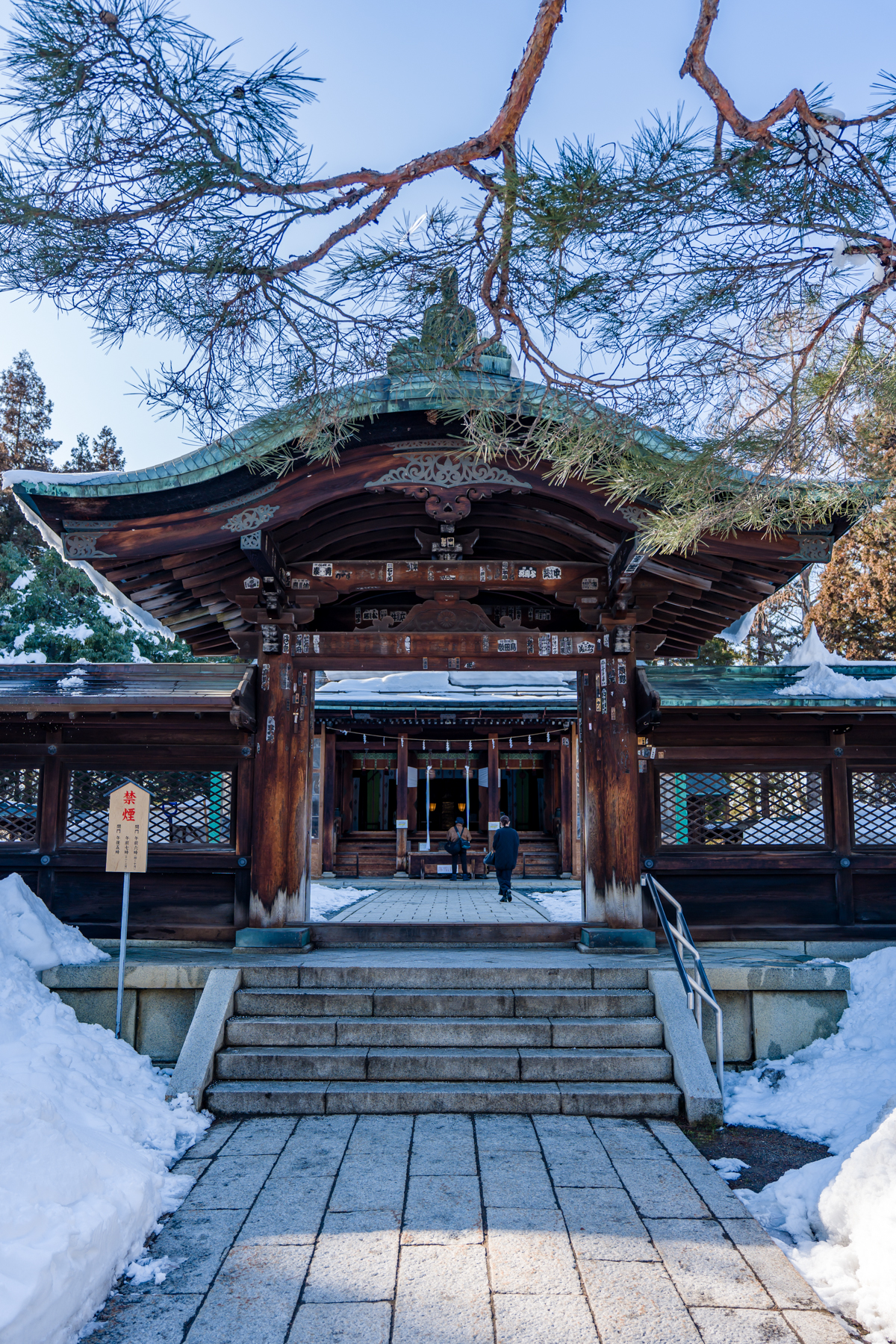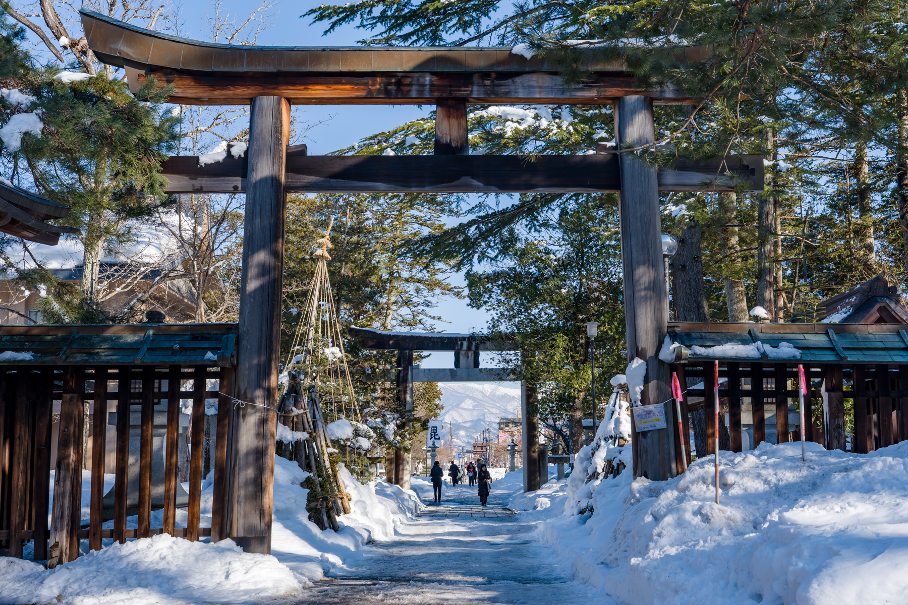 そしてこちらは上杉神社。米沢城本丸跡に建てられた神社です。参道が完全に雪に埋まっていて、冬の雪国らしい風情がある。雪国の生まれとしては懐かしい感覚に陥ります。