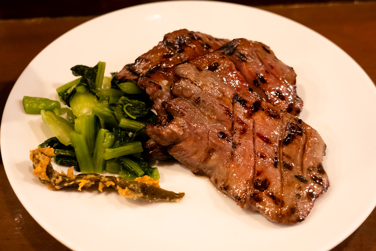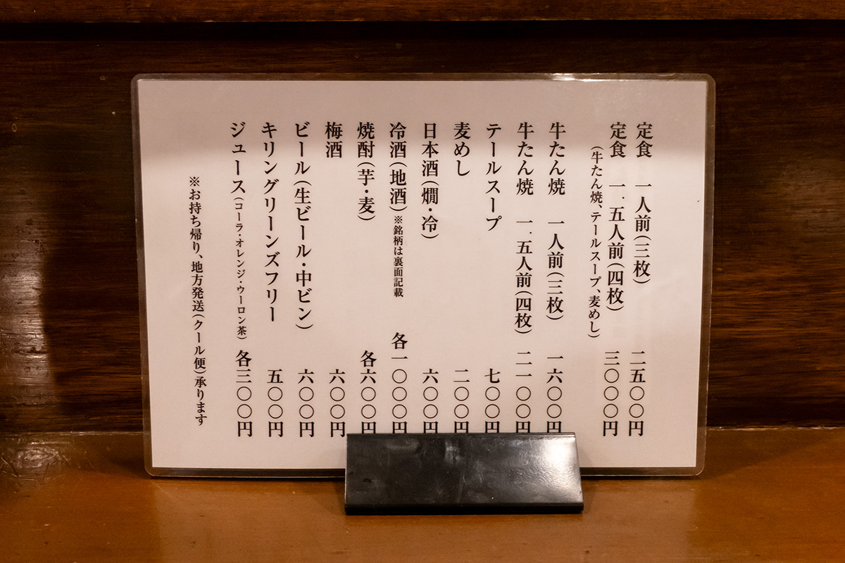 メニューは余計なものがなくとにかく牛たん焼一筋なところに老舗の実直さと強さを感じる。牛たん焼は1人前(3枚)か1.5人前(4枚)の二択で、それ以上も以下もありません。