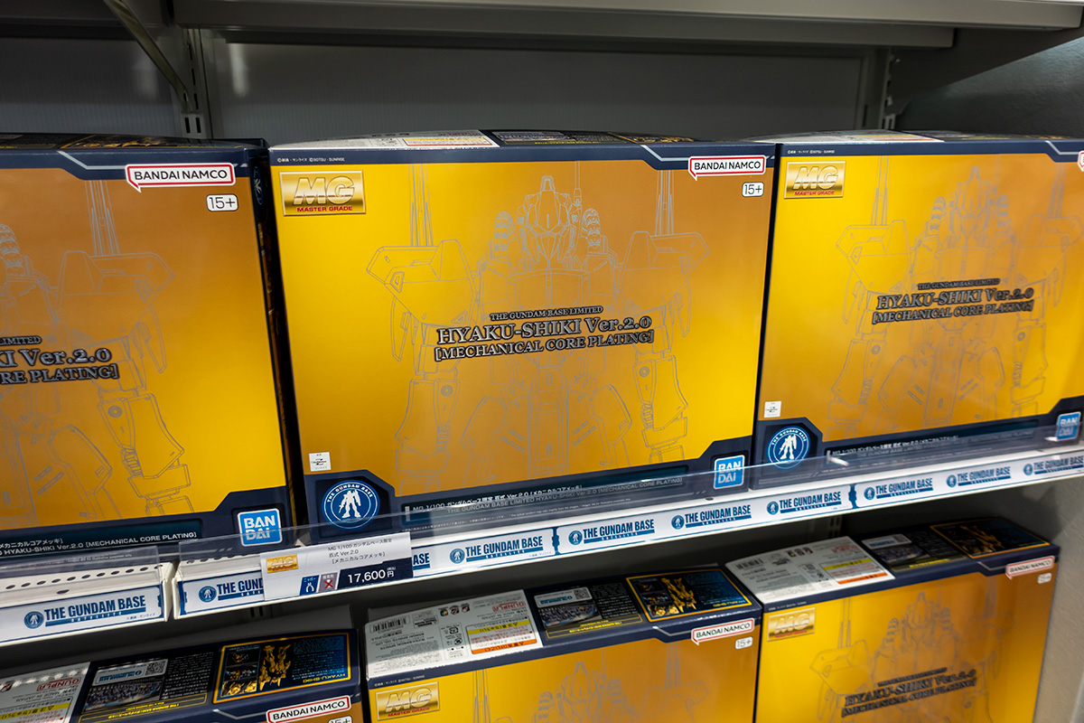 あとMG百式 Ver.2.0のメカニカルコアメッキ版も山積みされていました。ゴールドの装甲パーツをクリアカラーにしてその裏から金メッキするという恐ろしく凝ったキット。めちゃくちゃカッコいいのは知っているし金メッキ機体好きとしてはとても気になるのですが、1.7万はさすがにないなあ。できれば組立サンプルだけでも拝みたかったところですが残念ながら展示は無し。